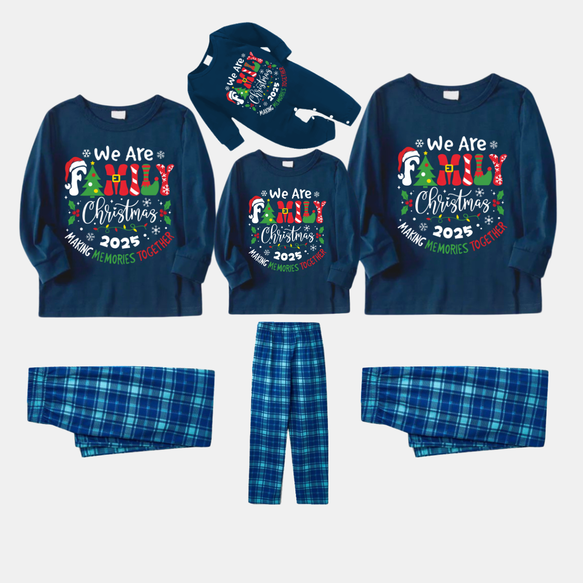 We Are Family Christmas 2025 Making Memories Family Pajamas Set - Black Top, Blue Pants, Blue Plaid Sleeves