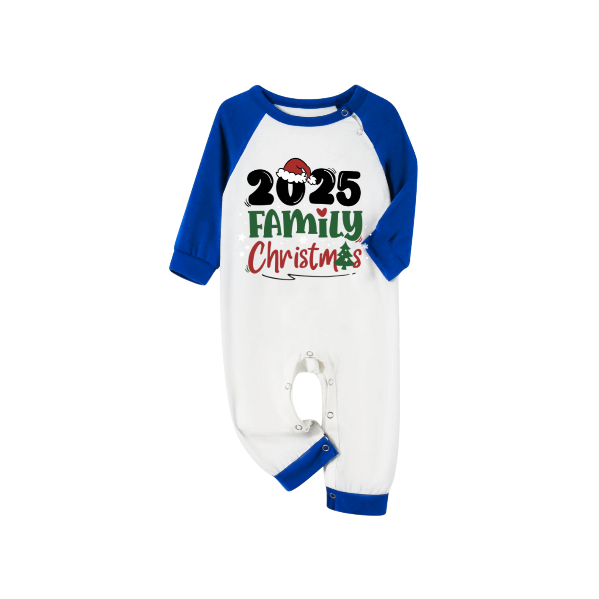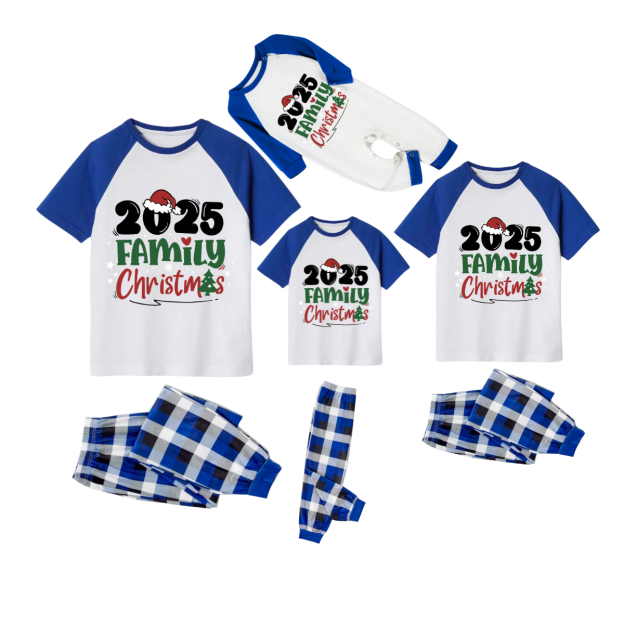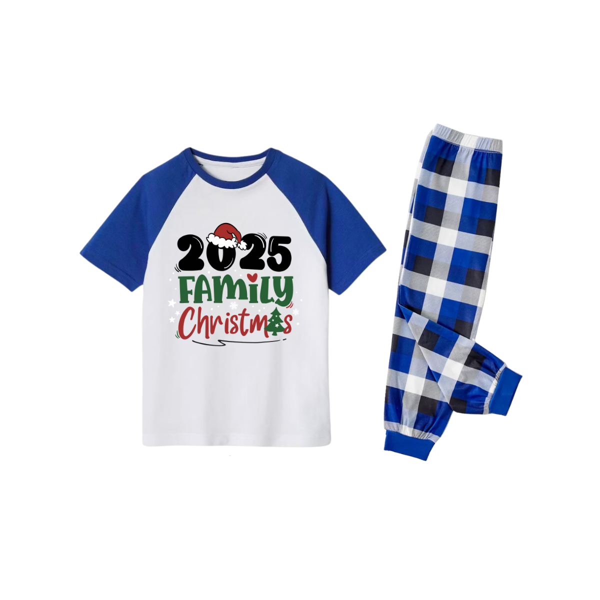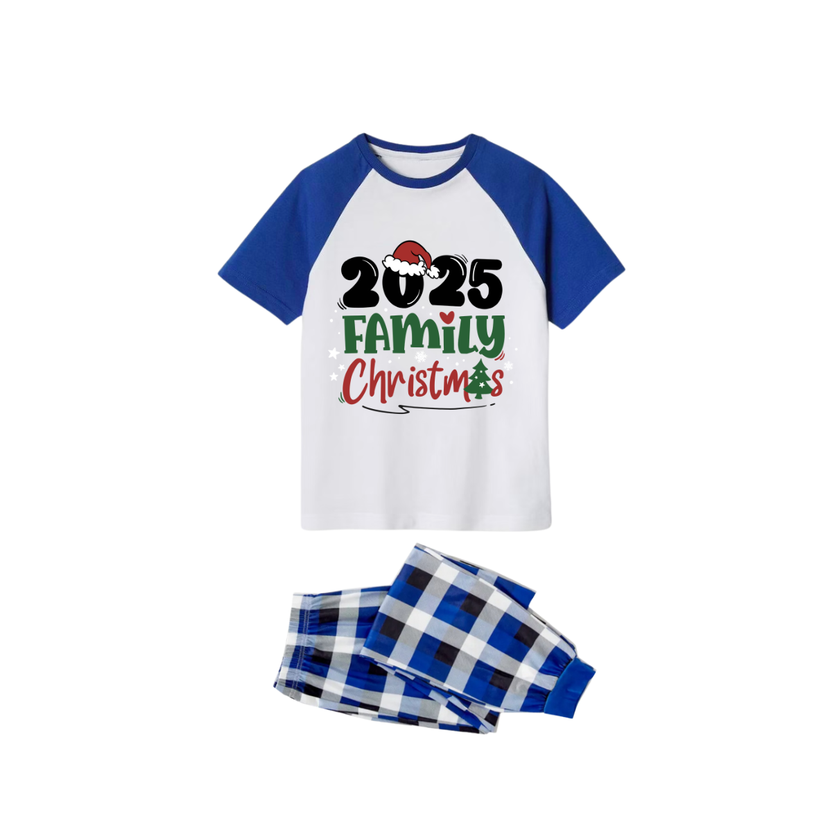 2025 Family Christmas Pajamas Set - White Top Blue Sleeves Blue Plaid Pants Green and Red Text Graphic