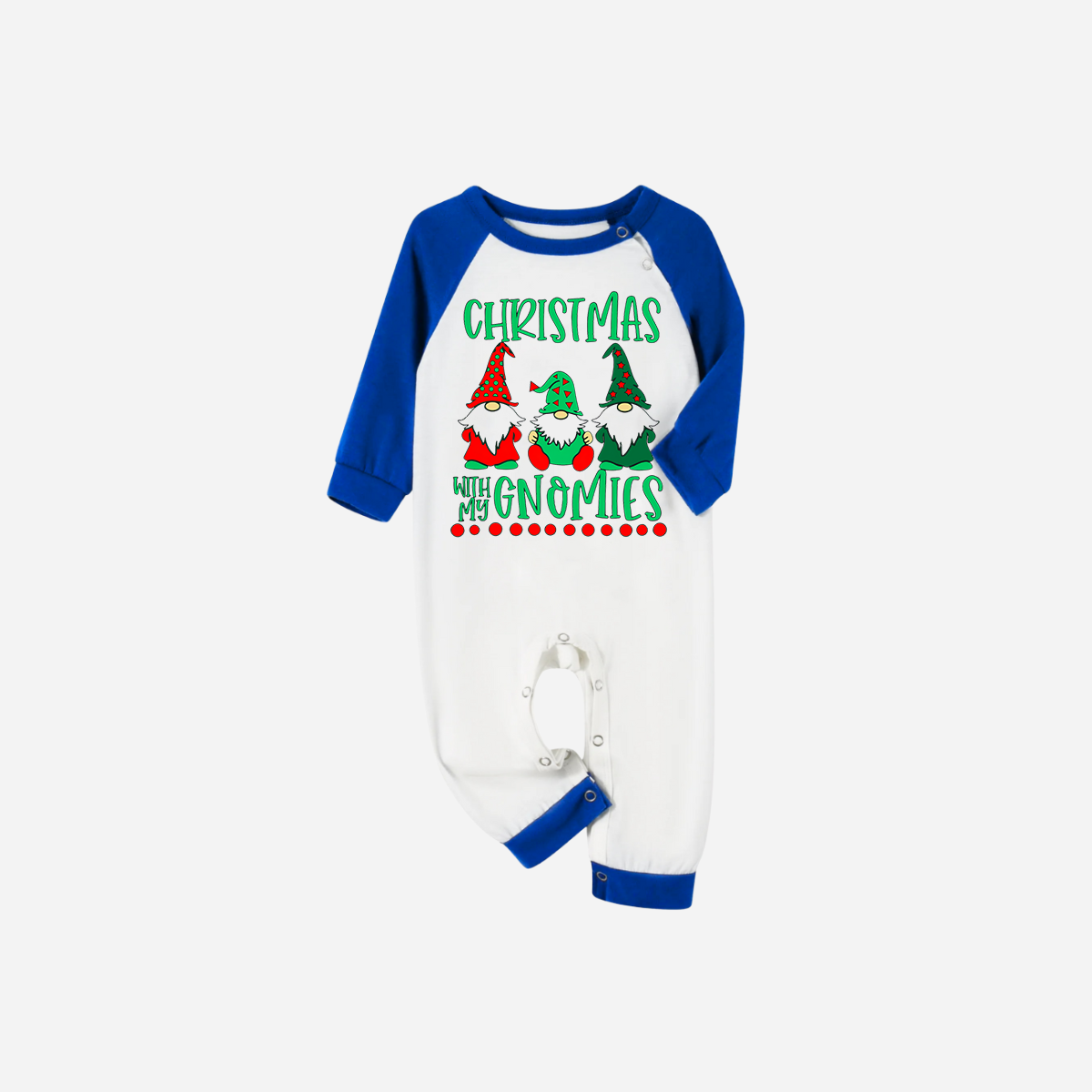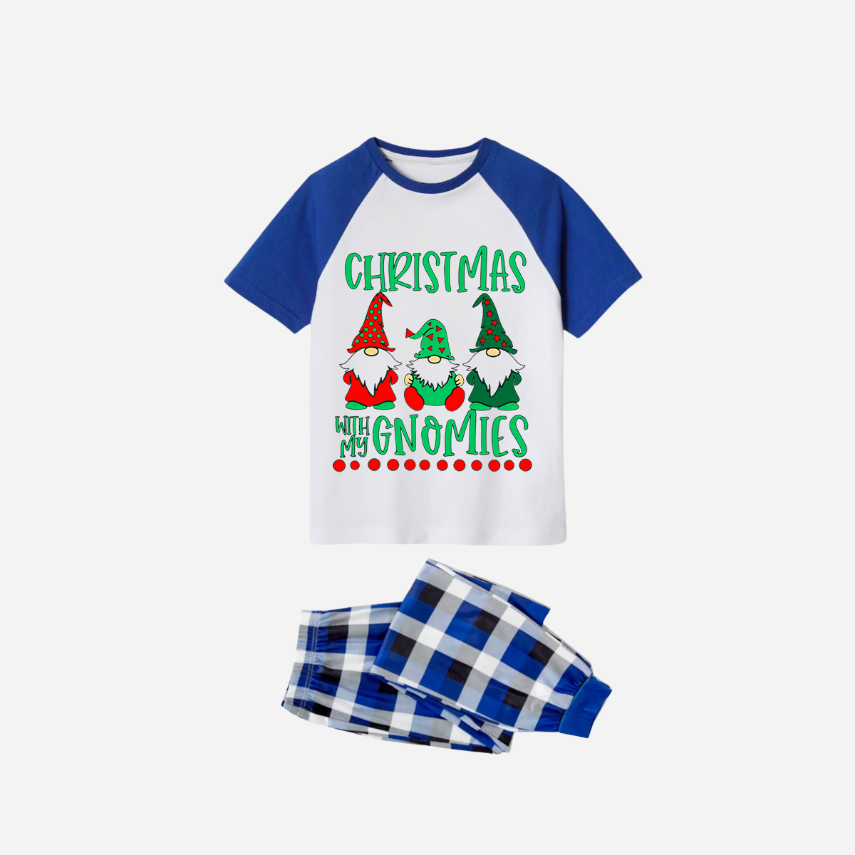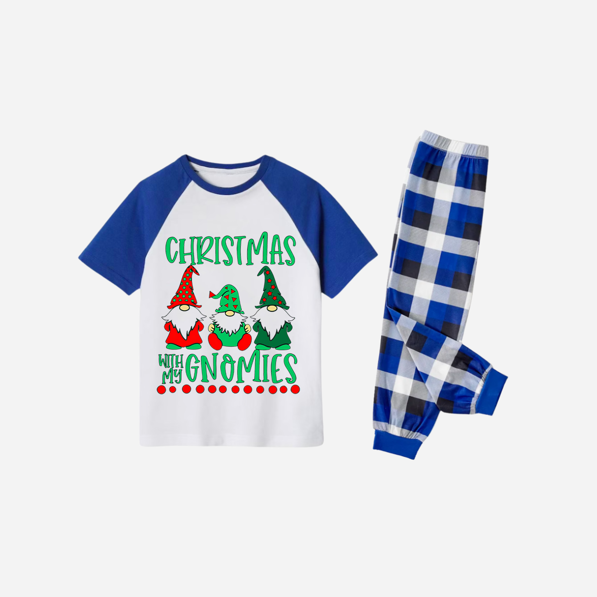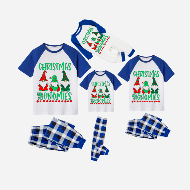 Blue Plaid Short Sleeve Christmas Pajamas Set With "Christmas With My Gnomies" Text Print