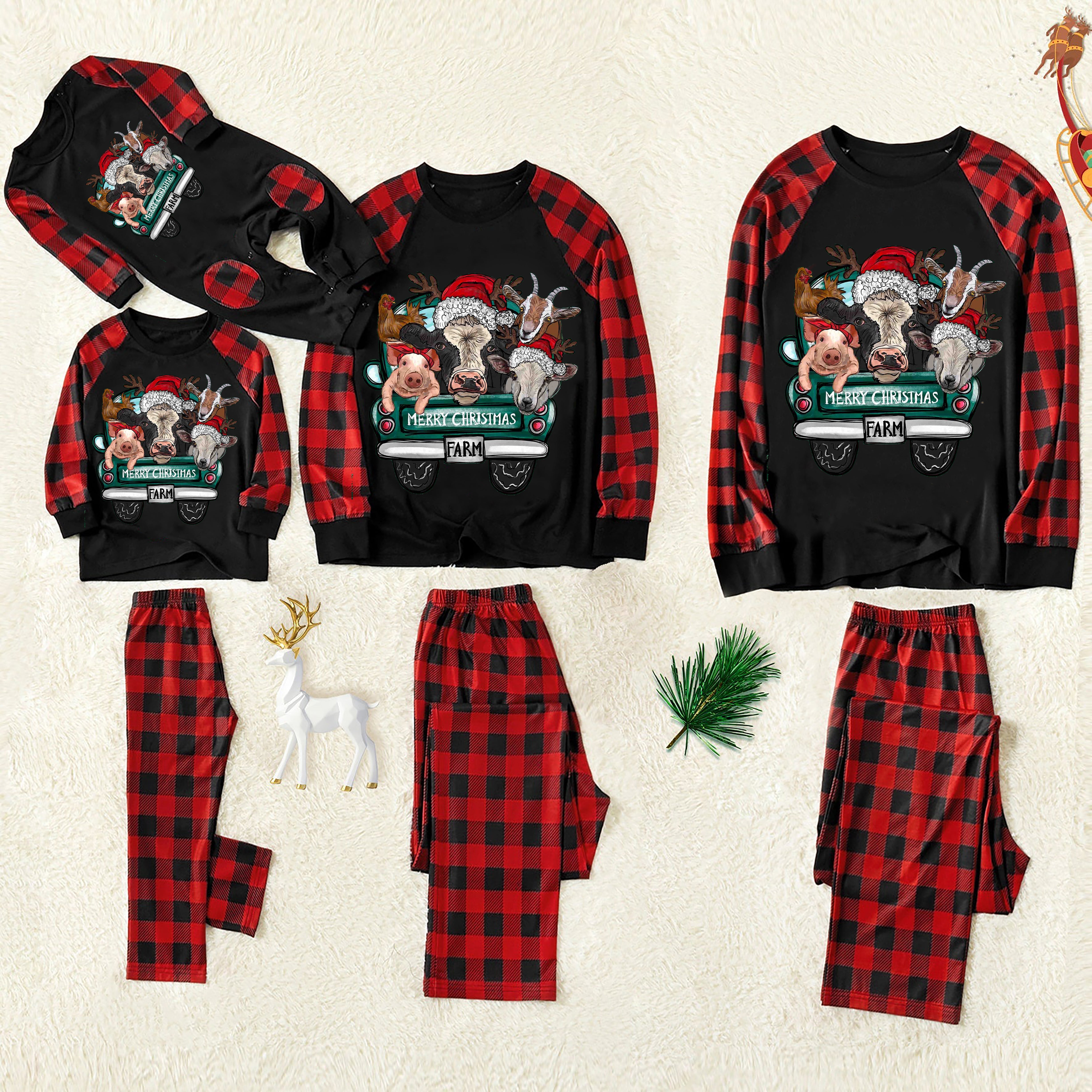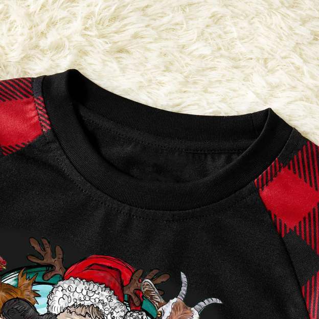 Christmas Cute Cartoon Car Highland Cow Farm Animals Heifers Christmas Cow Patterned and 'Merry Christmas' Letter Print Contrast Black top and Black & Red Plaid Pants Family Matching Pajamas Set