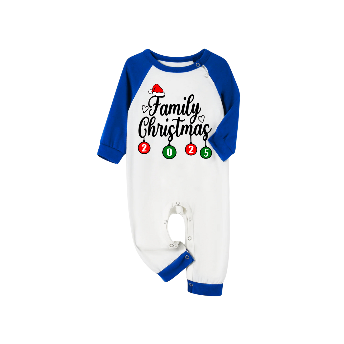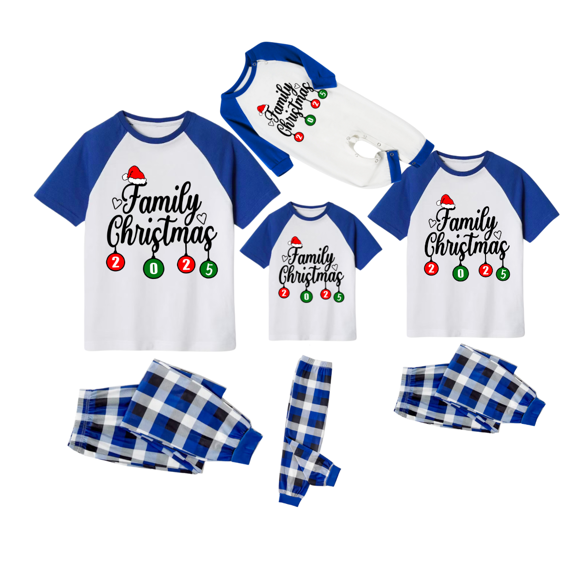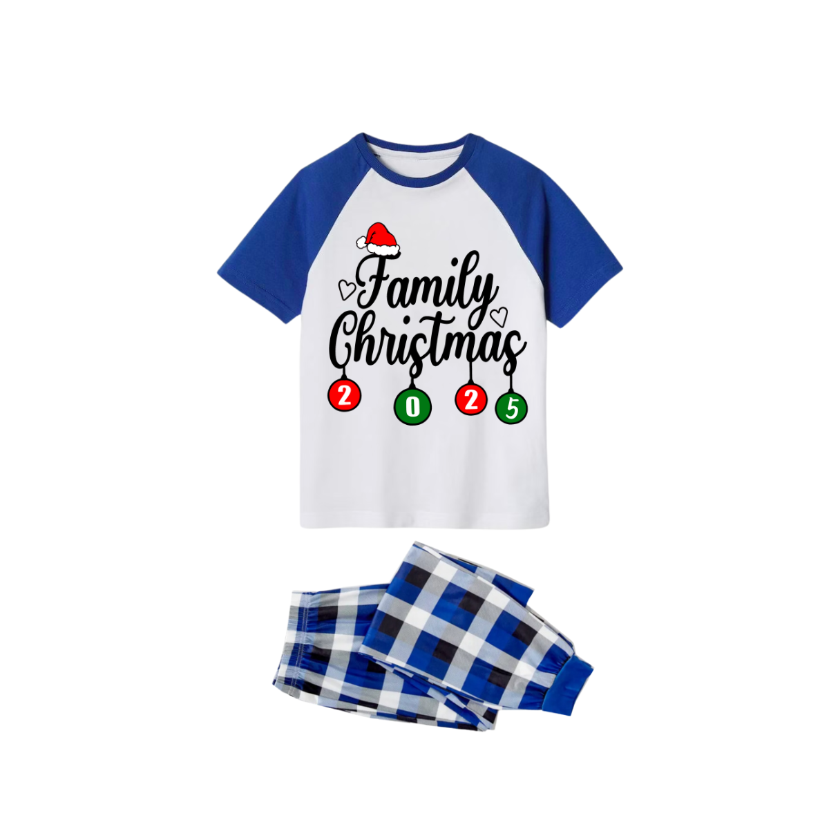 Family Christmas 2025 Family Pajamas Set - White Top Blue Sleeves Blue Plaid Pants Santa Hat and Heart Graphic