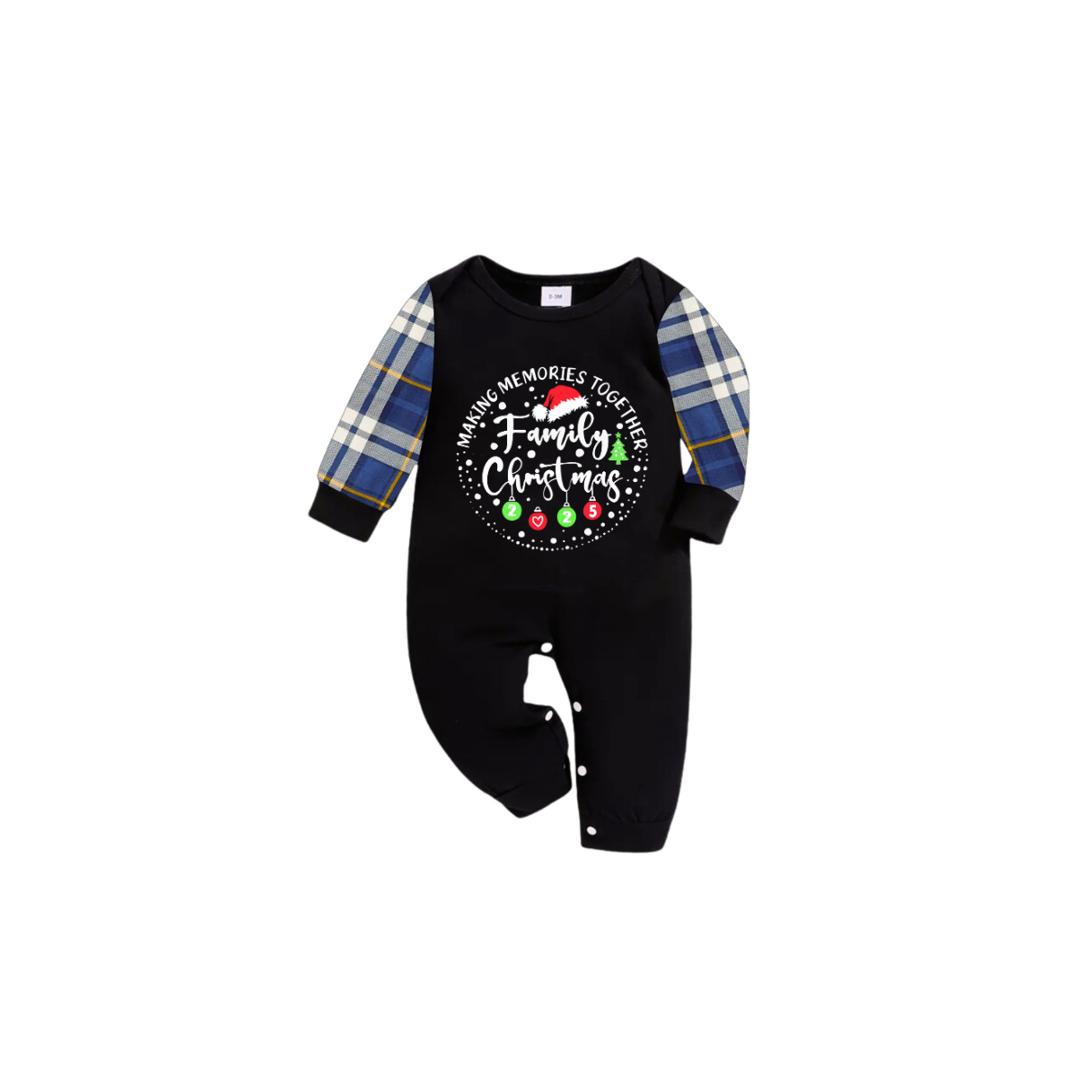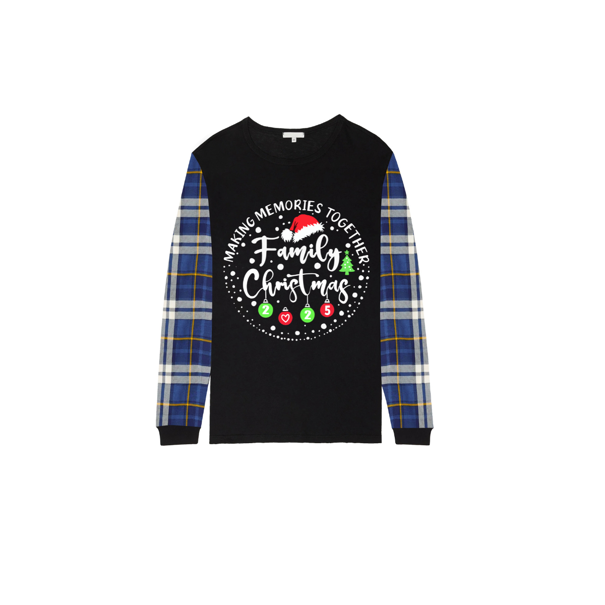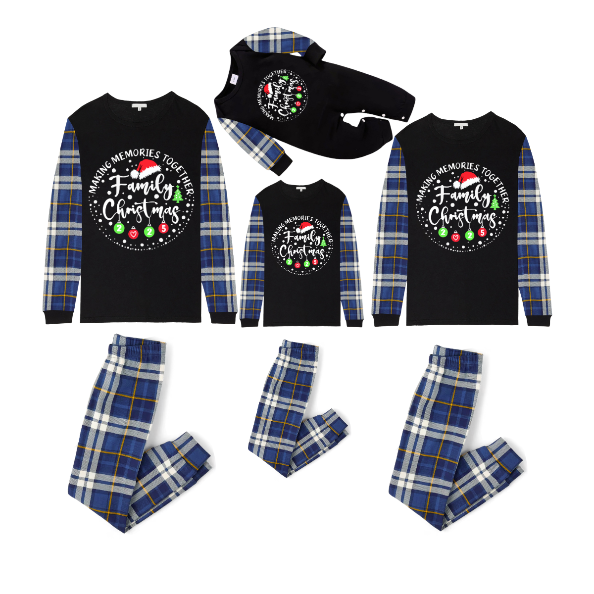 Making Memories Together Family Christmas 2025 Family Pajamas Set - Black Top, Blue Pants, Blue Plaid Sleeves