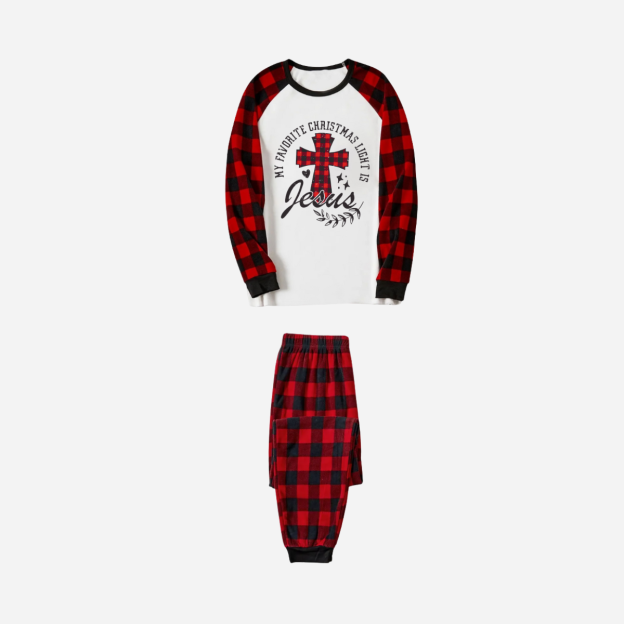 My Favorite Christmas Light Is Jesus Family Christmas Pajamas Set - White Top with Red Plaid Sleeves and Red Plaid Pants