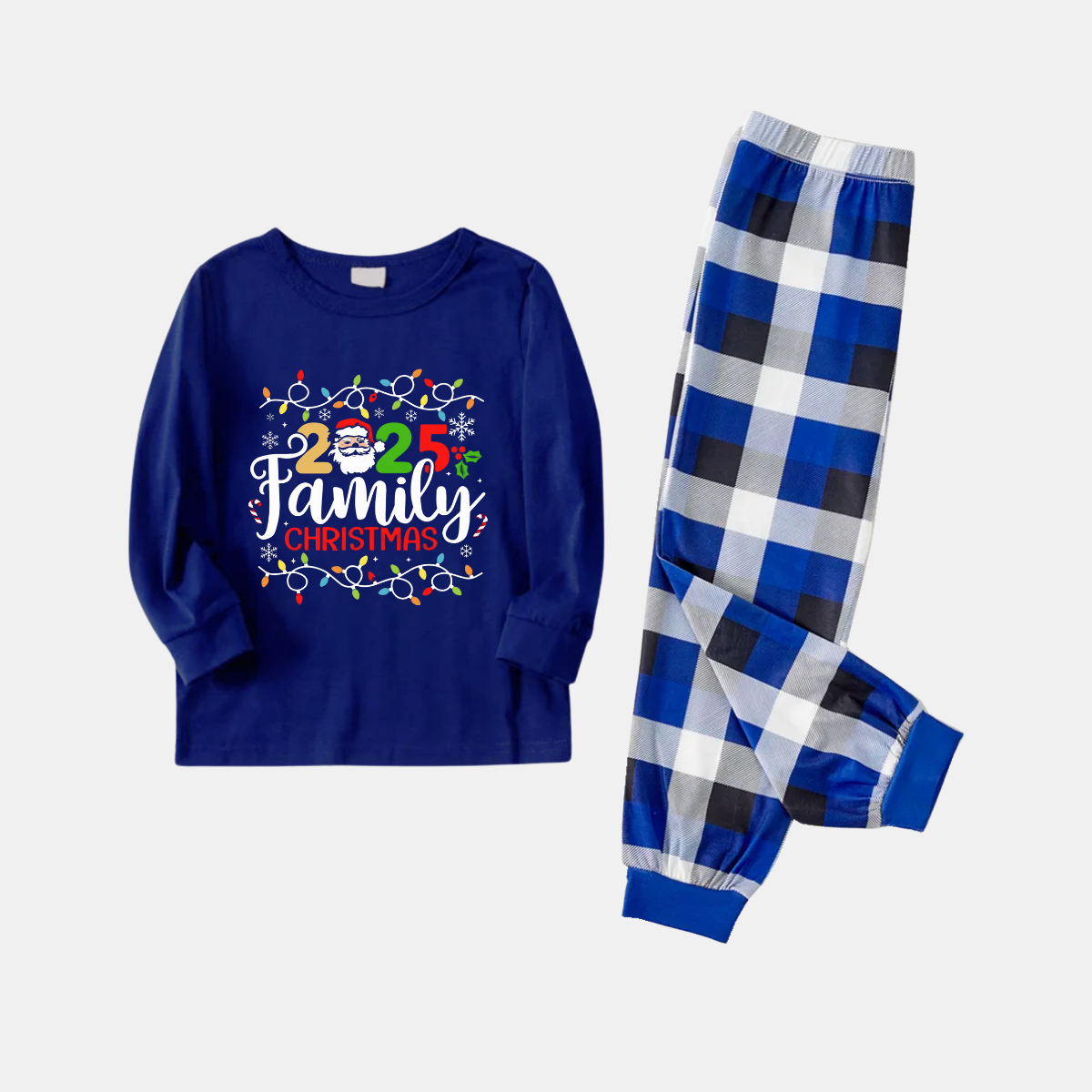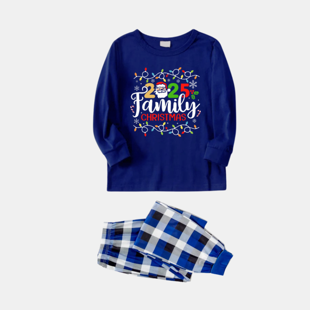 Navy & White Plaid Christmas Pajamas Set With Christmas Light and "2025 Family Christmas" Text Print