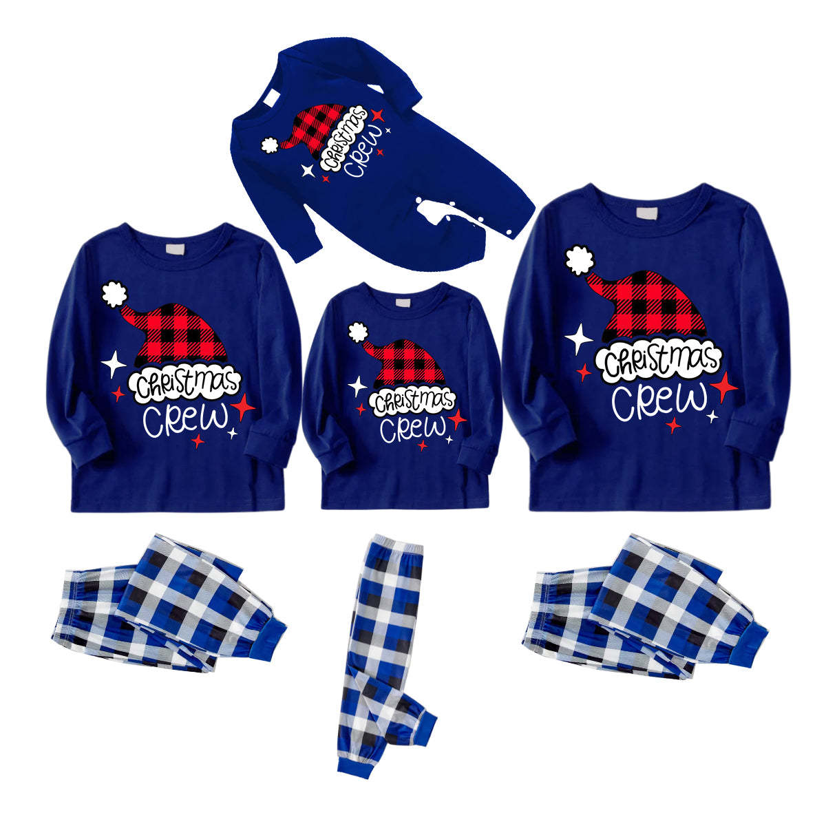Plaid Santa Hat Pattern Blue Long Sleeves with Blue&White&Black Plaid Pants Family Matching Pajamas