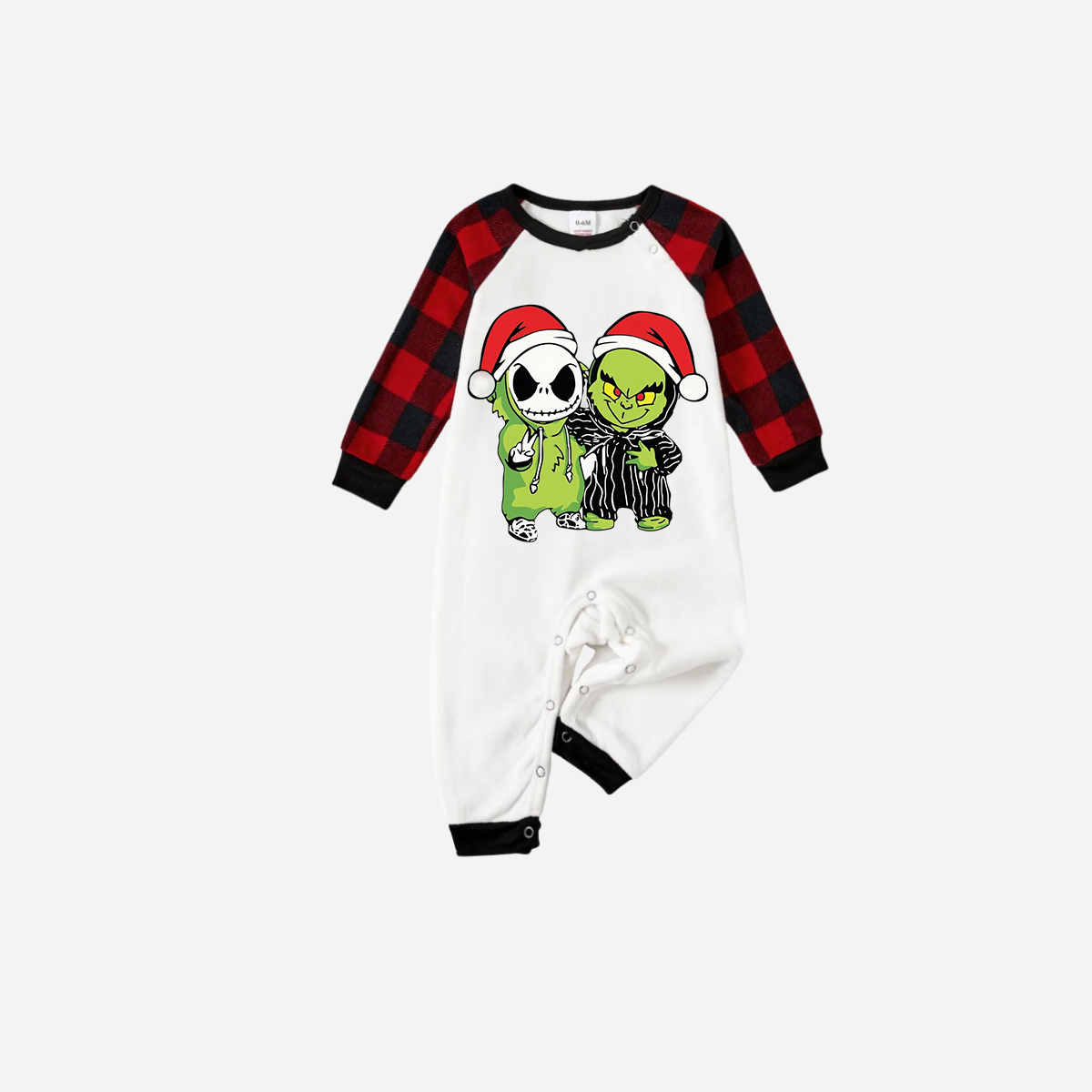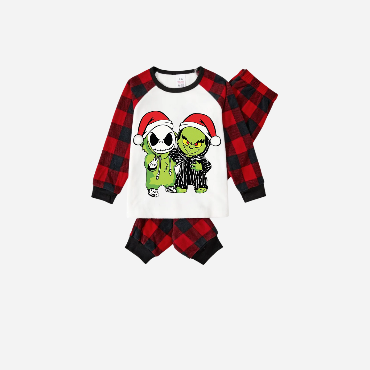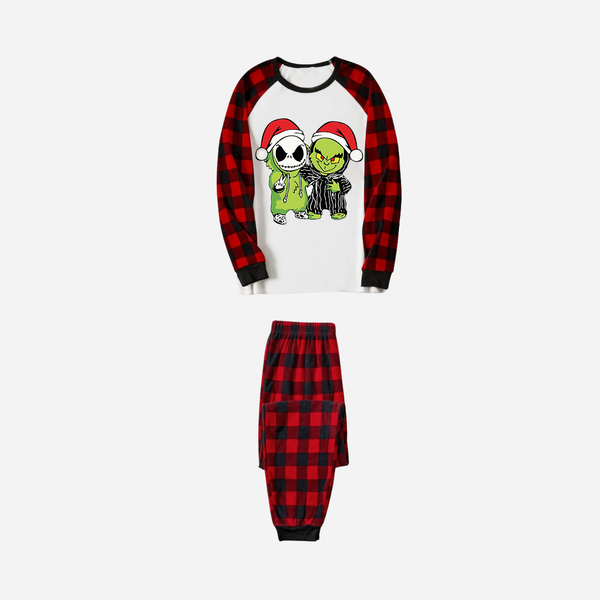 Red and Black Plaid Christmas Pajamas Set With Grinch and Cartoon Pattern Print
