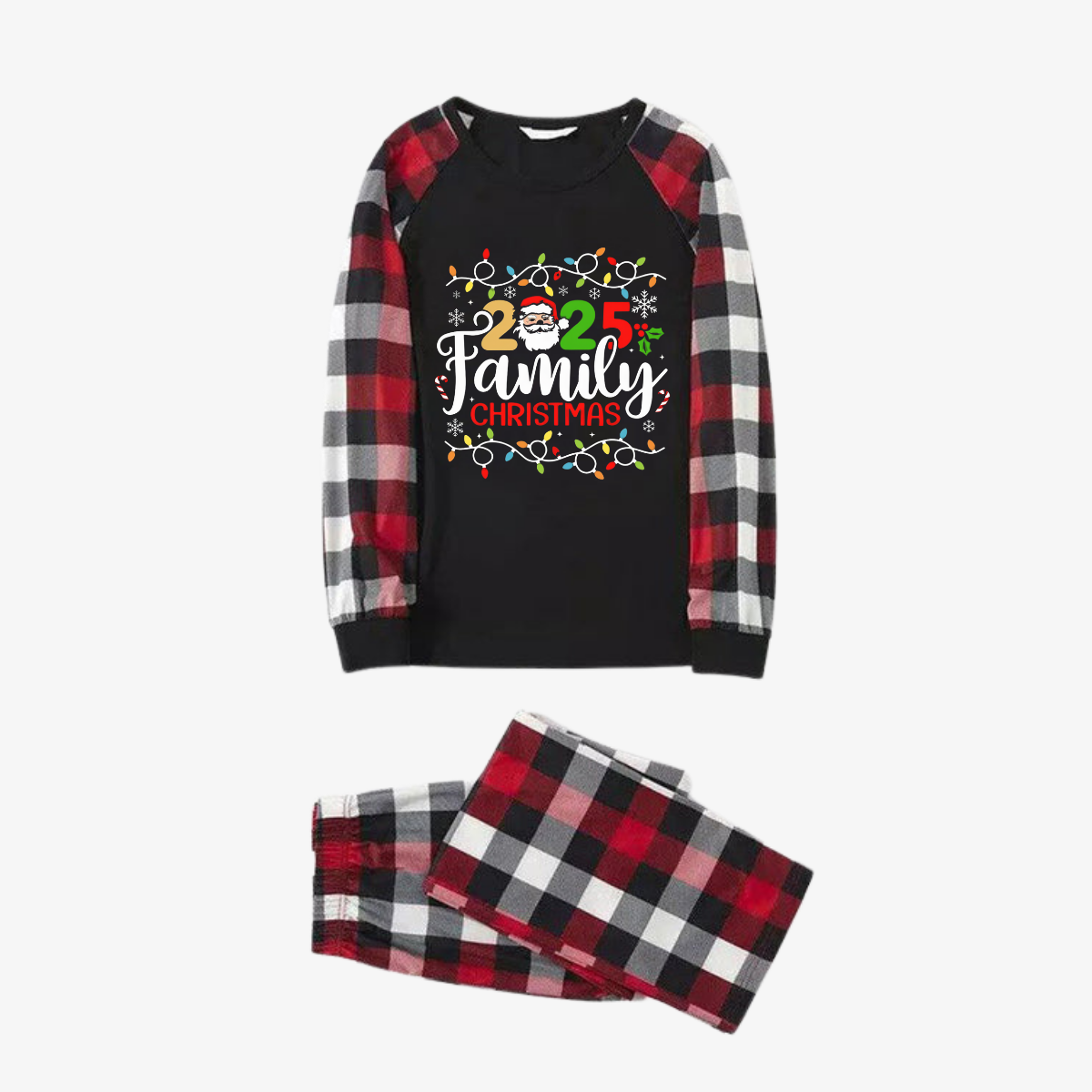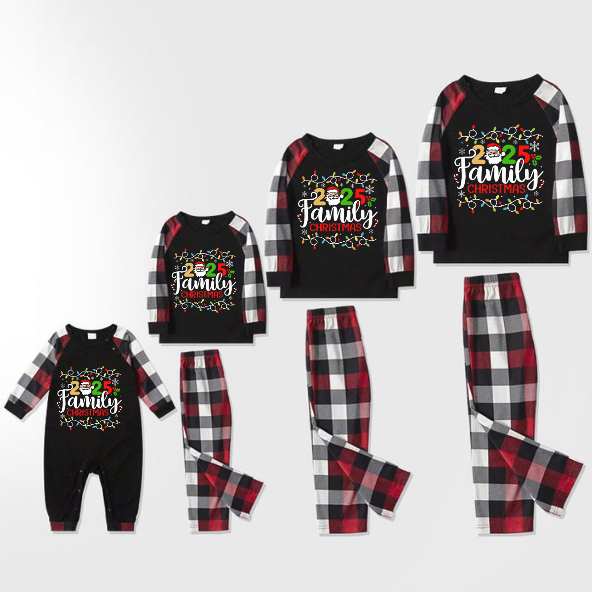 Red and Gray Plaid Christmas Pajamas Set With Christmas Light and "2025 Family Christmas" Text Print