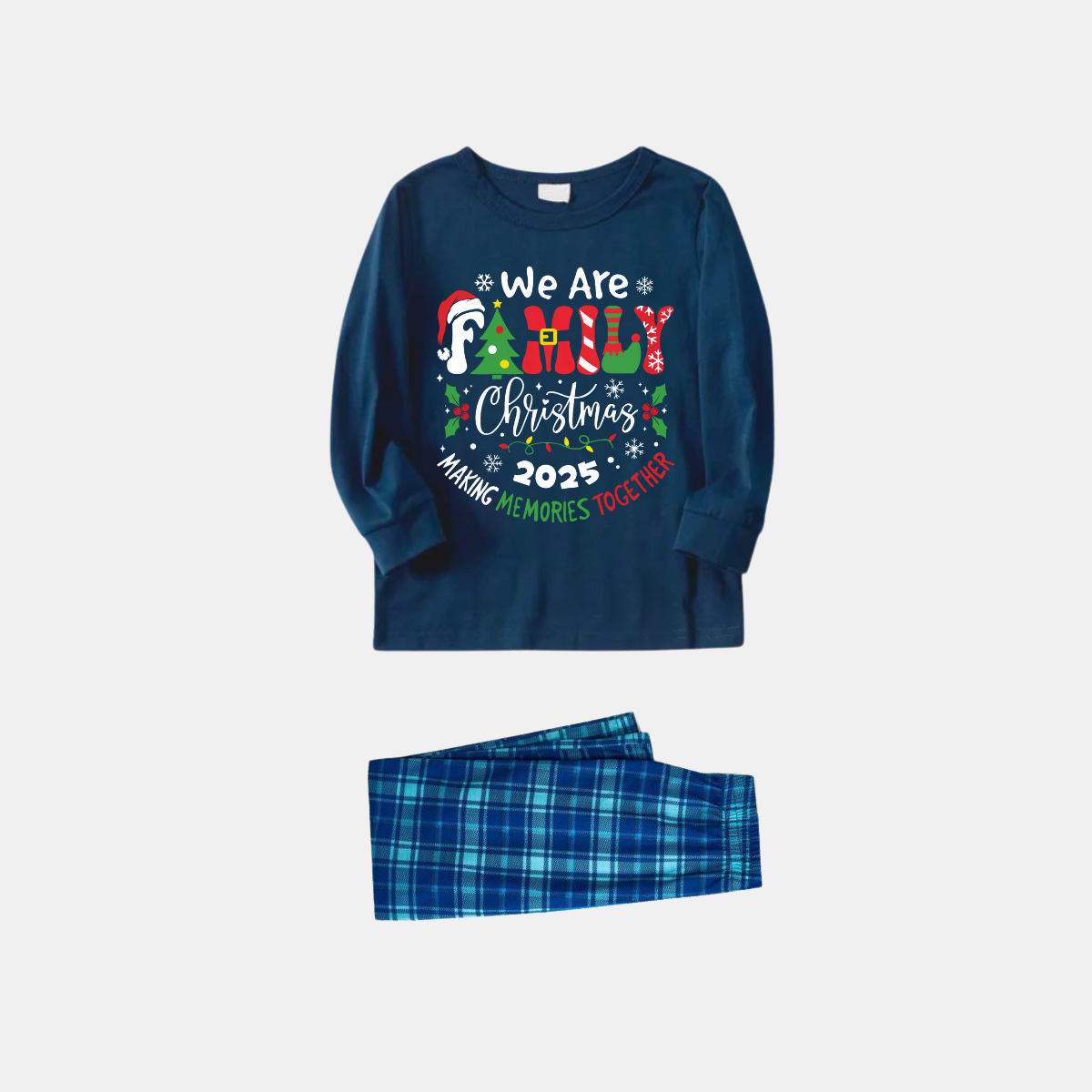 "We are Family" 2025 Christmas Wreath - Blue Long Sleeve Top With Blue Plaid Family Matching Pajamas