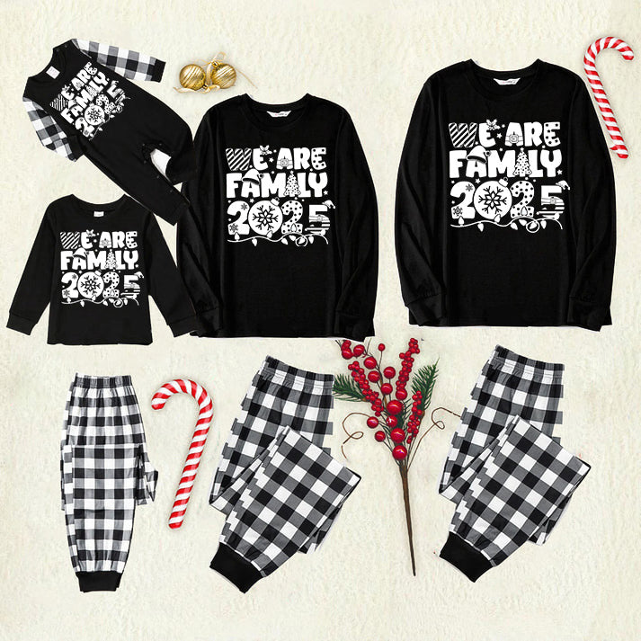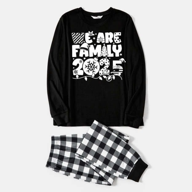 "We are Family 2025" White Letter Print Black Long Sleeve Top with Black And White Plaid Pants Family Matching Pajamas