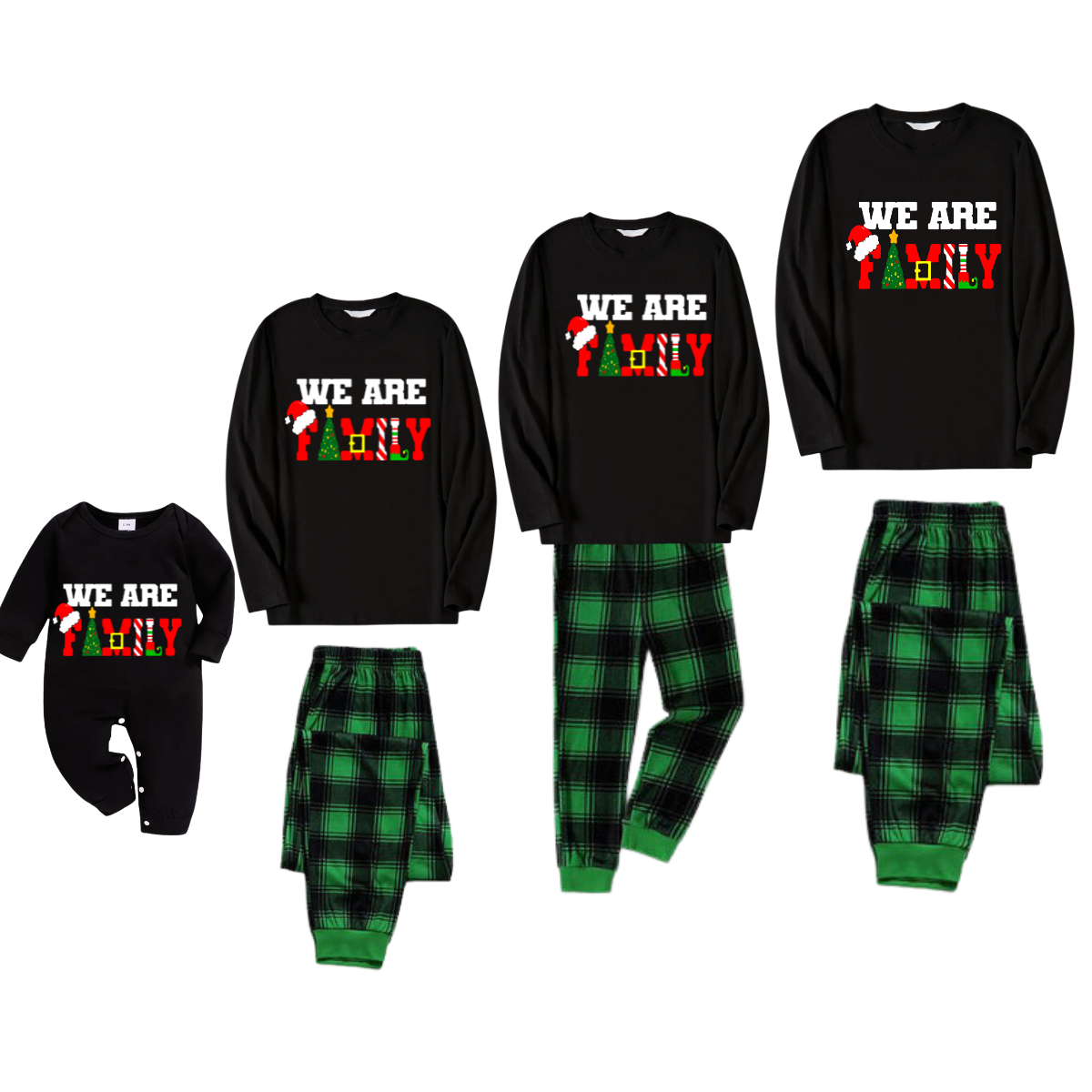 We Are Family Christmas 2025 Making Memories Family Pajamas Set - Black Top, Green Pants, Green Plaid Sleeves