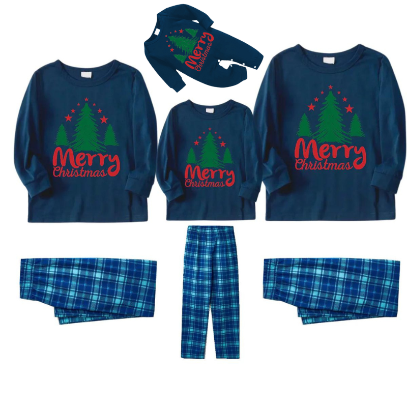 Merry Christmas Letter & Tree Printed Pattern Blue Long Sleeve Top and Blue & White Plaid Pants Family Matching Pajamas