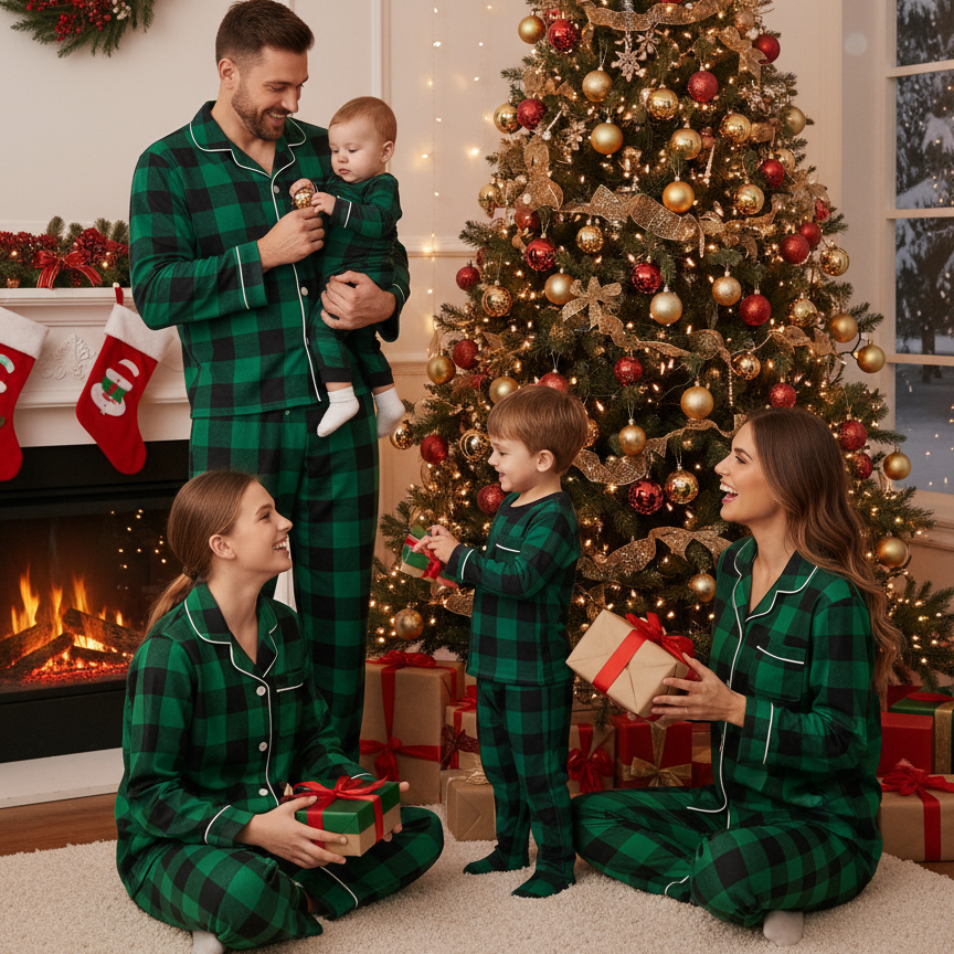 Christmas Family Matching Green Plaid Button Up Long-sleeve Pajamas Sets