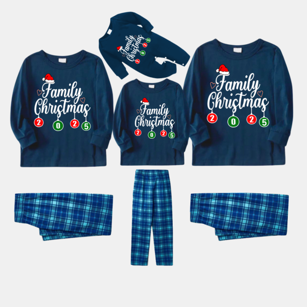 "Family Christmas 2025" Letter Printed Blue Long Sleeve Top With Blue Plaid Family Matching Pajamas