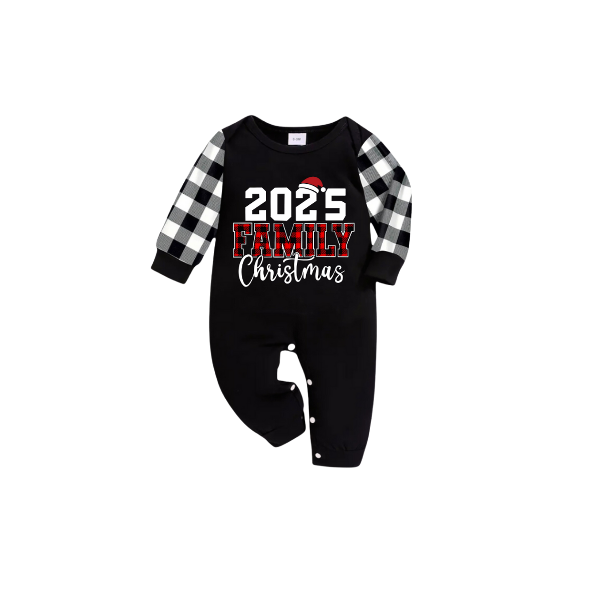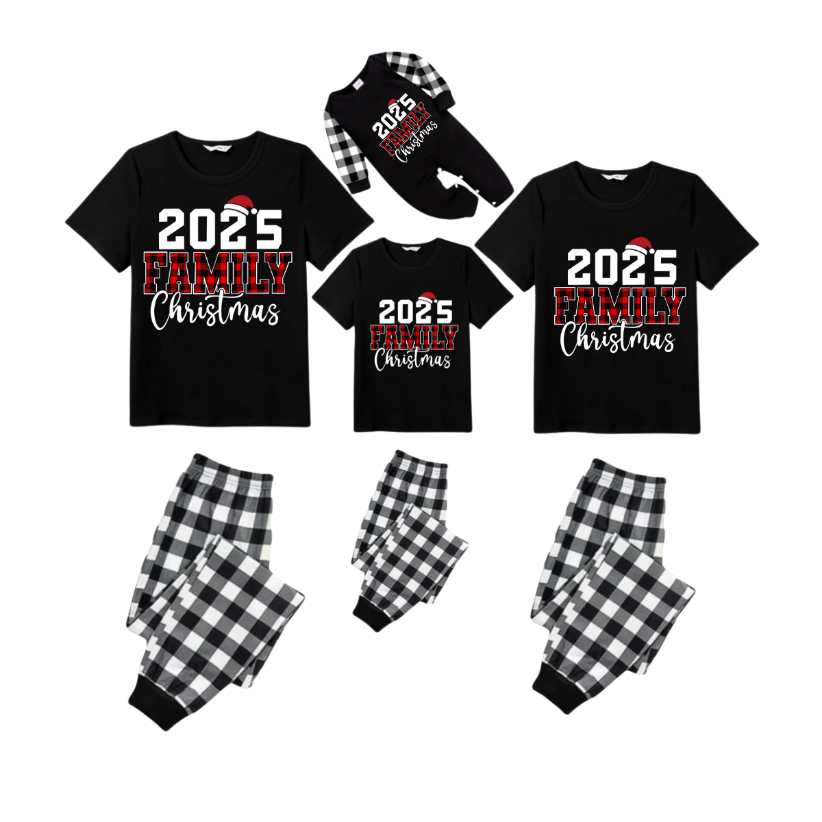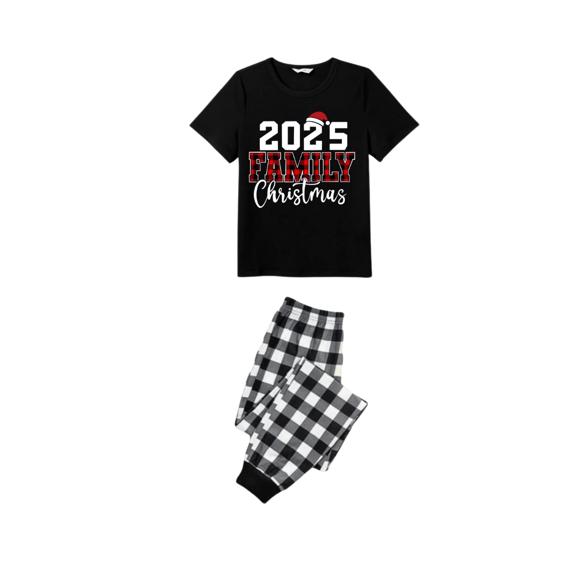 2025 Family Christmas Pajamas Set - Black Top Black and White Plaid Pants Red Plaid Text Graphic