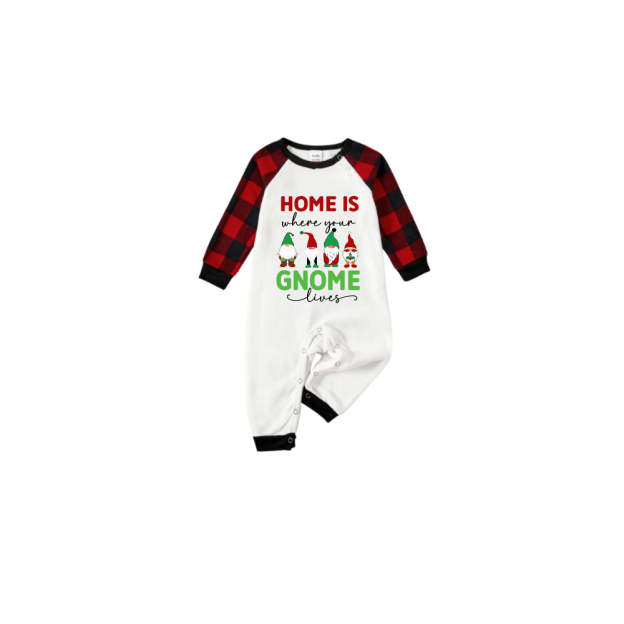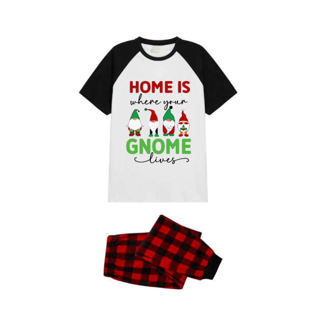 Black and Red Plaid Raglan Short Sleeve Pajamas Set With "Home Is Where Your Gnome Lives" Slogan Print