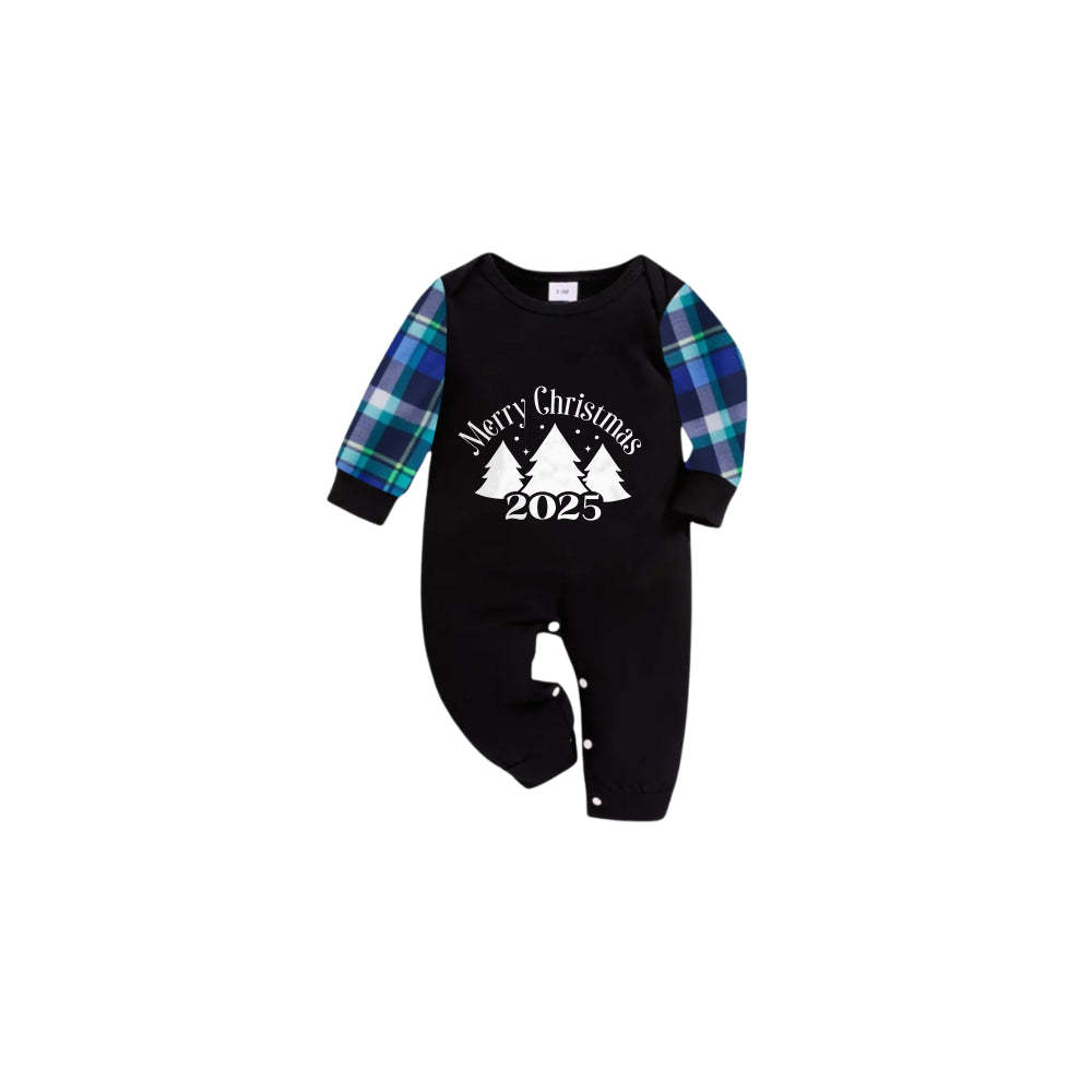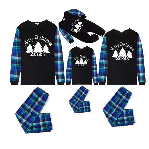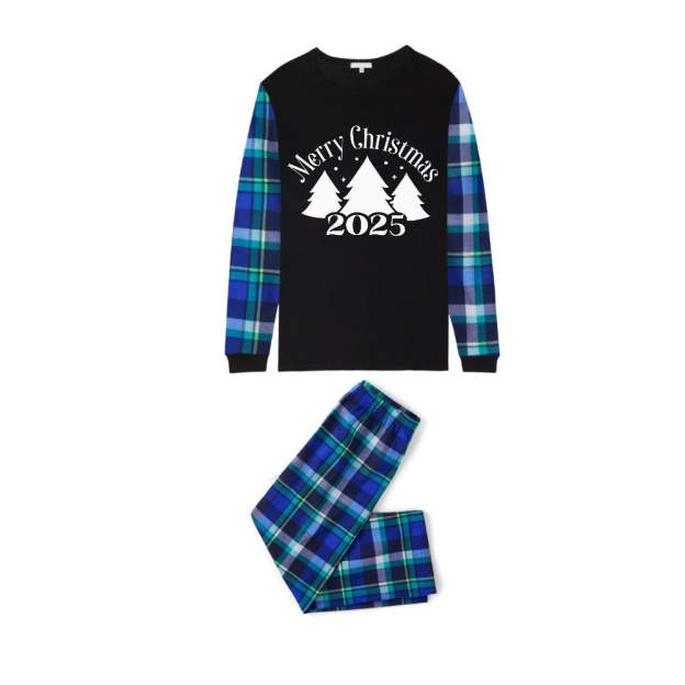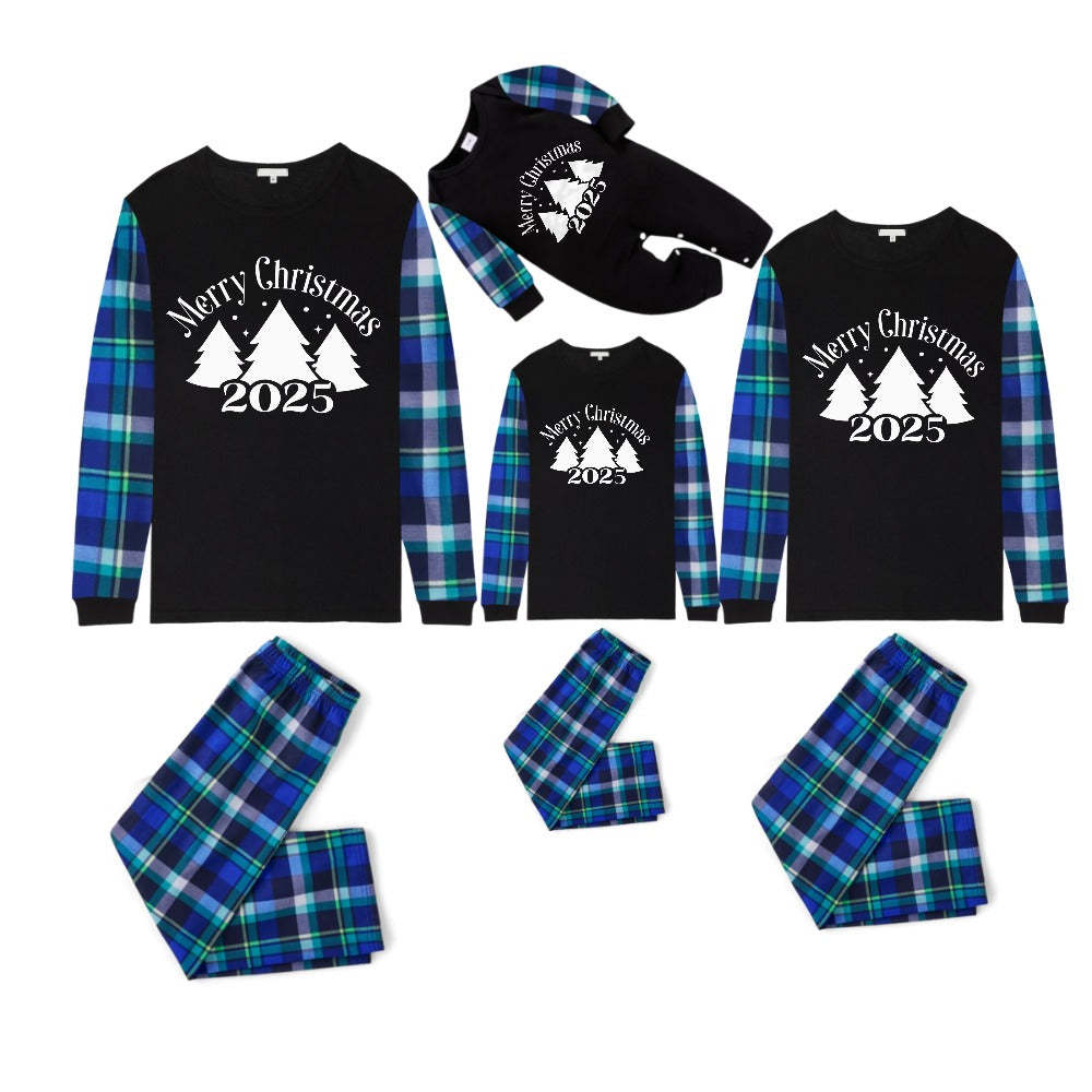 Blue and Green Plaid Christmas Pajamas Set With Christmas Trees and "Merry Christmas 2025" White and Black Print