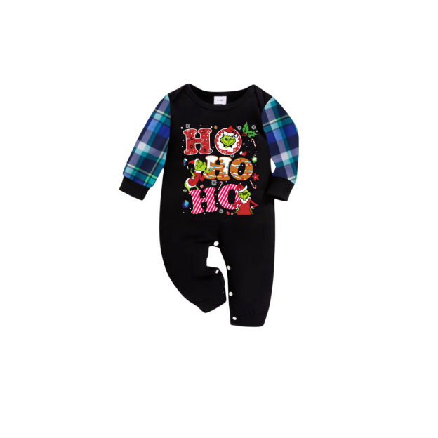 Blue and Green Plaid Christmas Pajamas Set With Grinch and "HO HO HO" Text Print