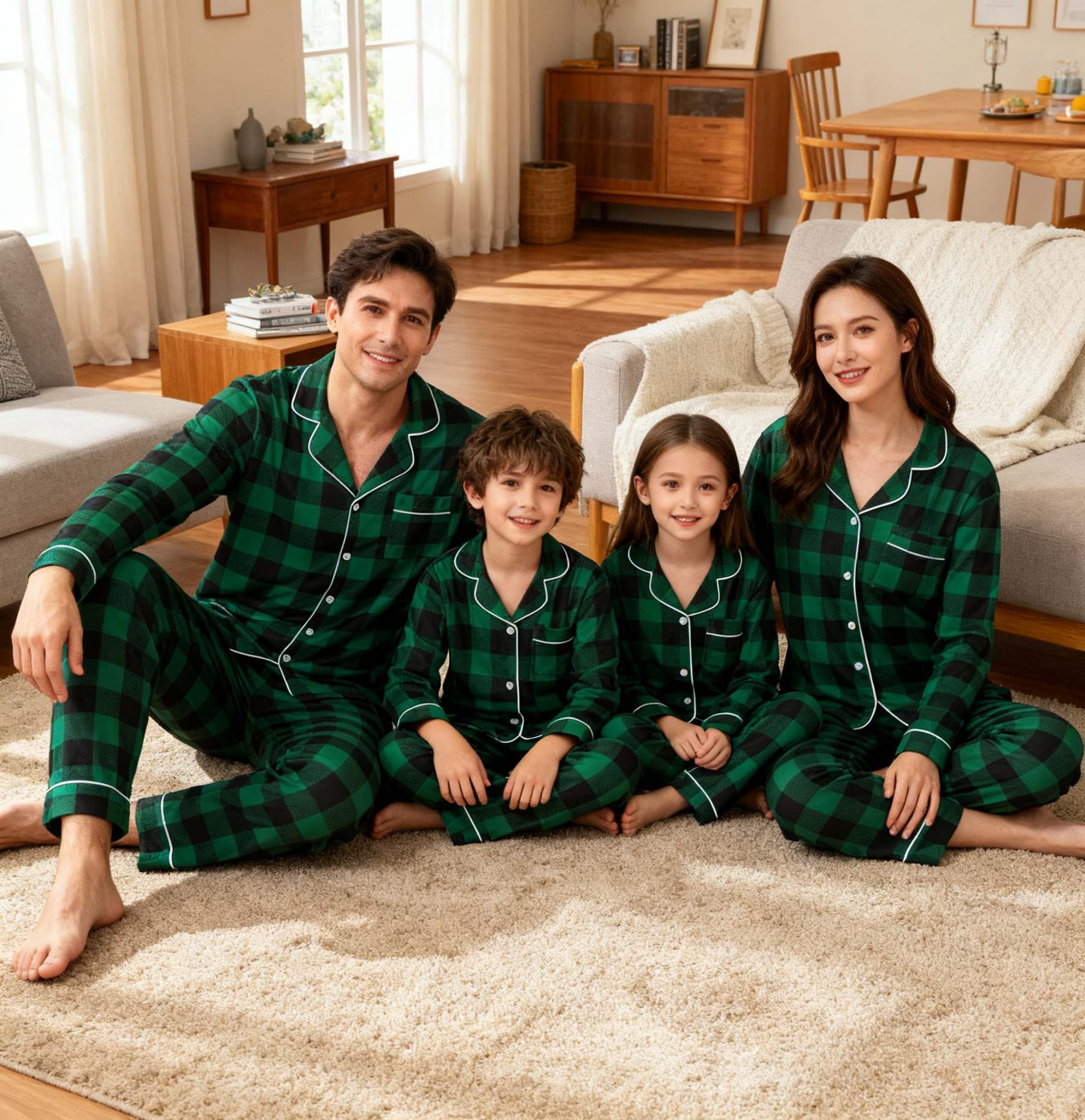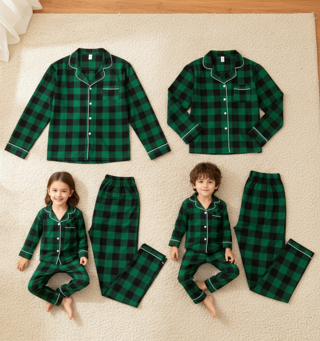 Christmas Family Matching Green Plaid Button Up Long-sleeve Pajamas Sets