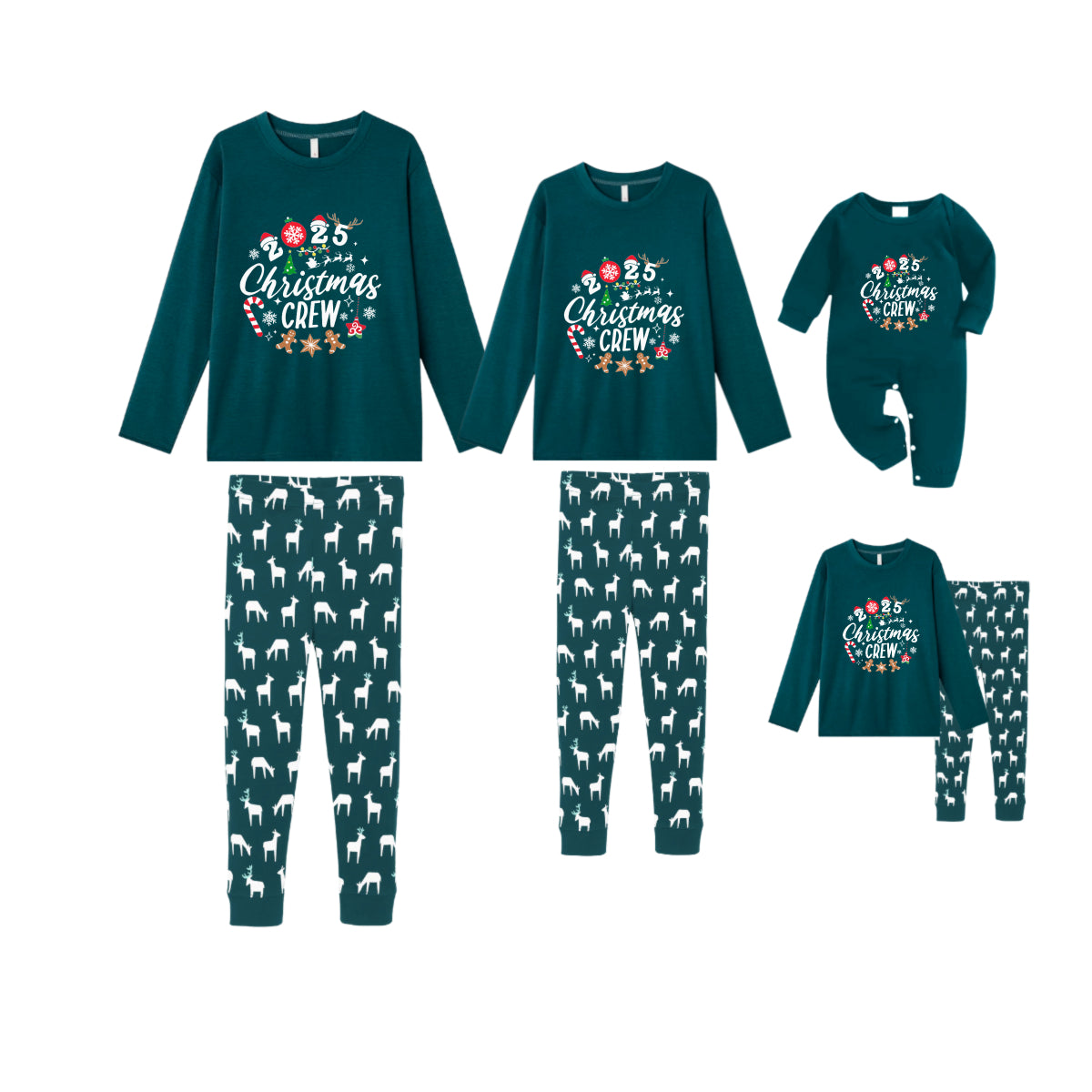 Christmas Family Matching Pajamas-Dark Green&Deer Patterned Pjs Set with "2025 Christmas Crew" Print