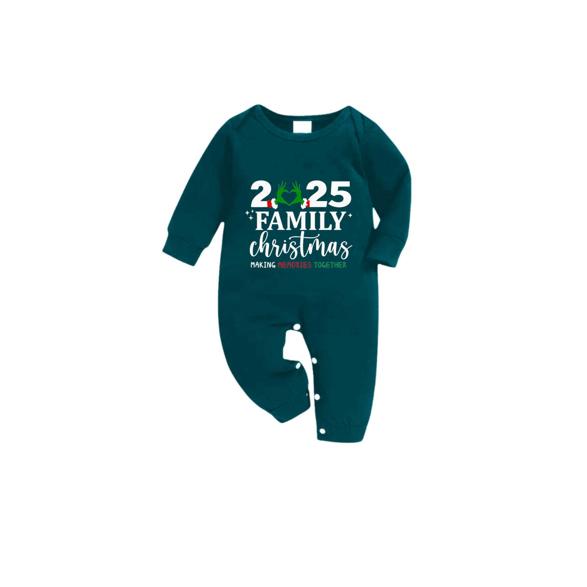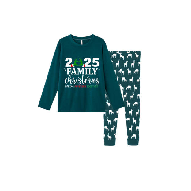 Christmas Family Matching Pajamas-Dark Green&Deer Patterned Pjs Set with Grinch motifs and "2025 Family Christmas" Slogan Print