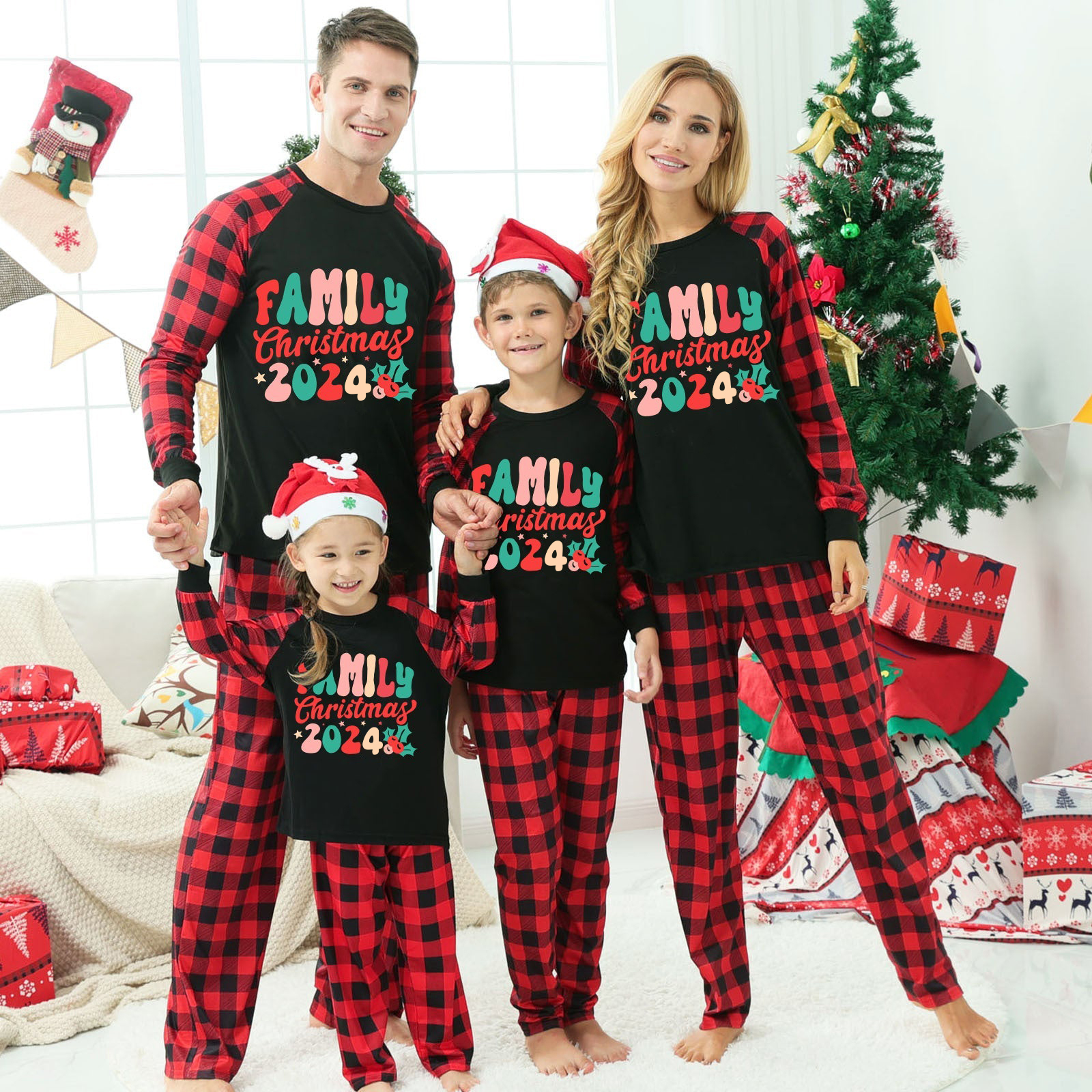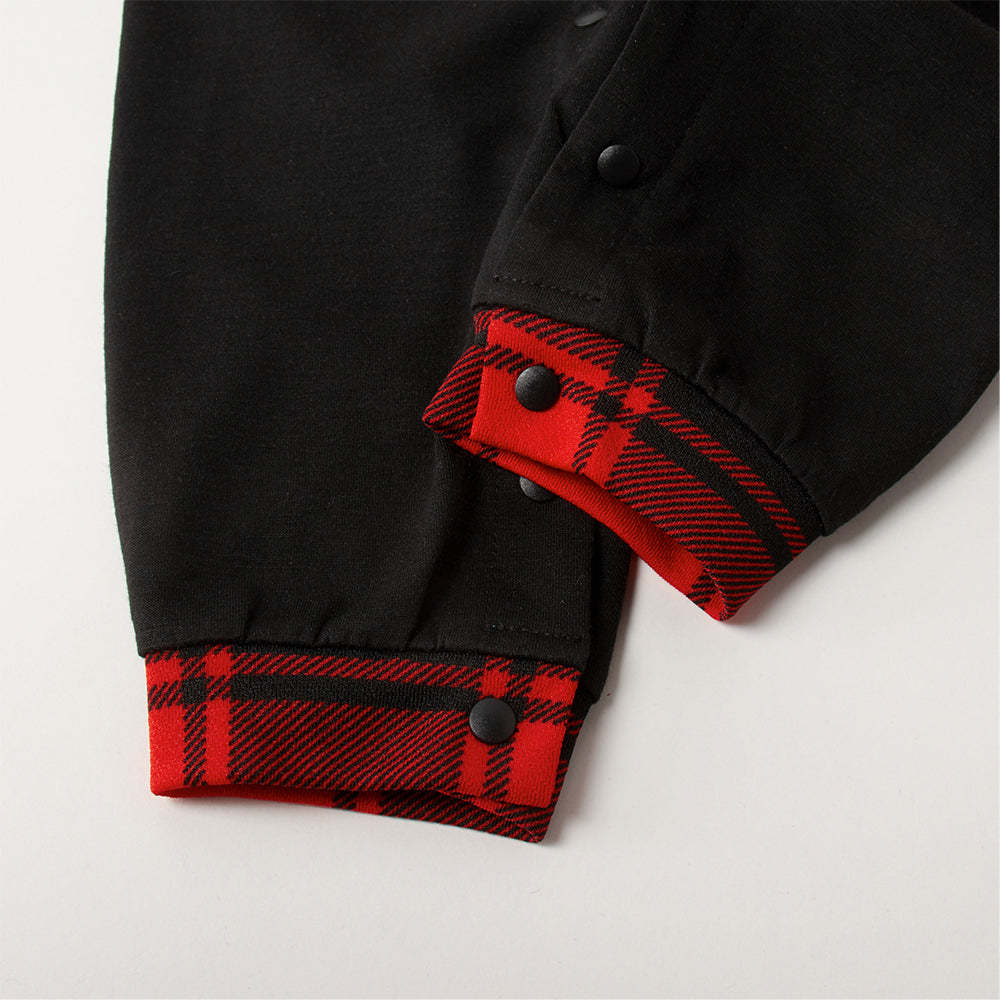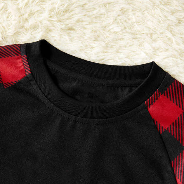 Christmas ��Ho Ho Ho�� Letter Print Santa Claus & Gingerbread & Elk Patterned Contrast Black top and Black & Red Plaid Pants Family Matching Pajamas Set With Dog Bandana