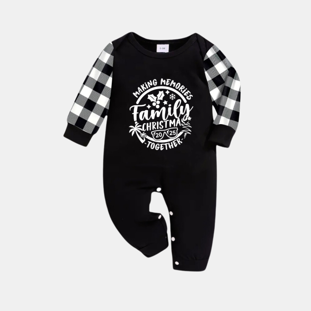 Christmas Make Memories Together 2025 Print Black Long Sleeve Top with Black And White Plaid Pants Family Matching Pajamas