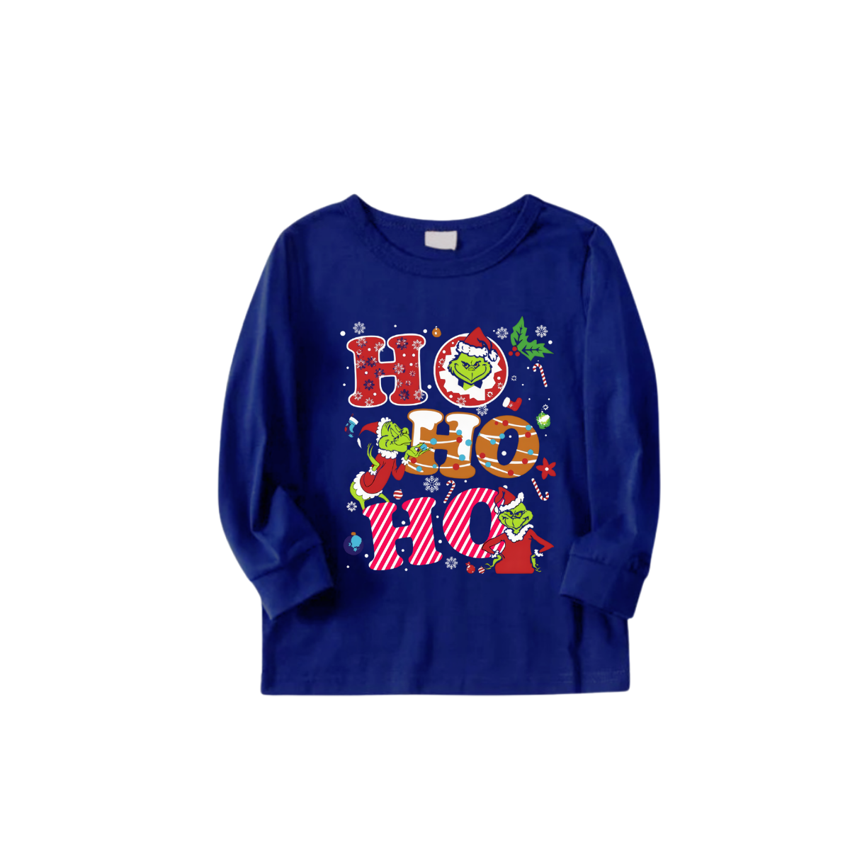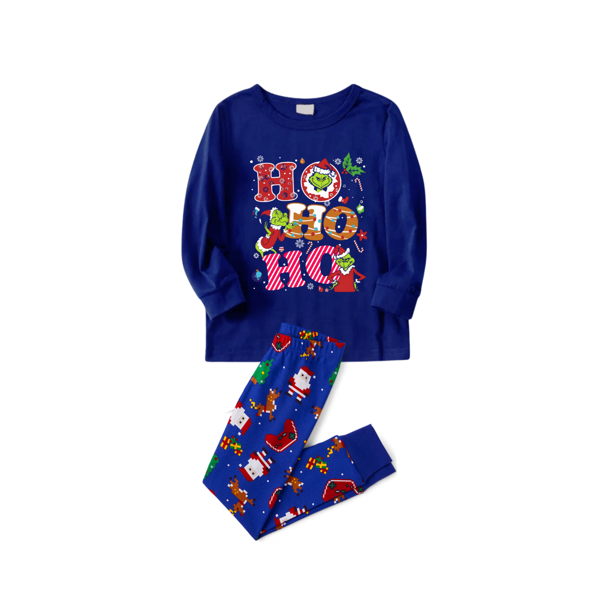 Cozy Blue Christmas Pajamas Set With Grinch and "HO HO HO" Text Print