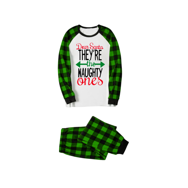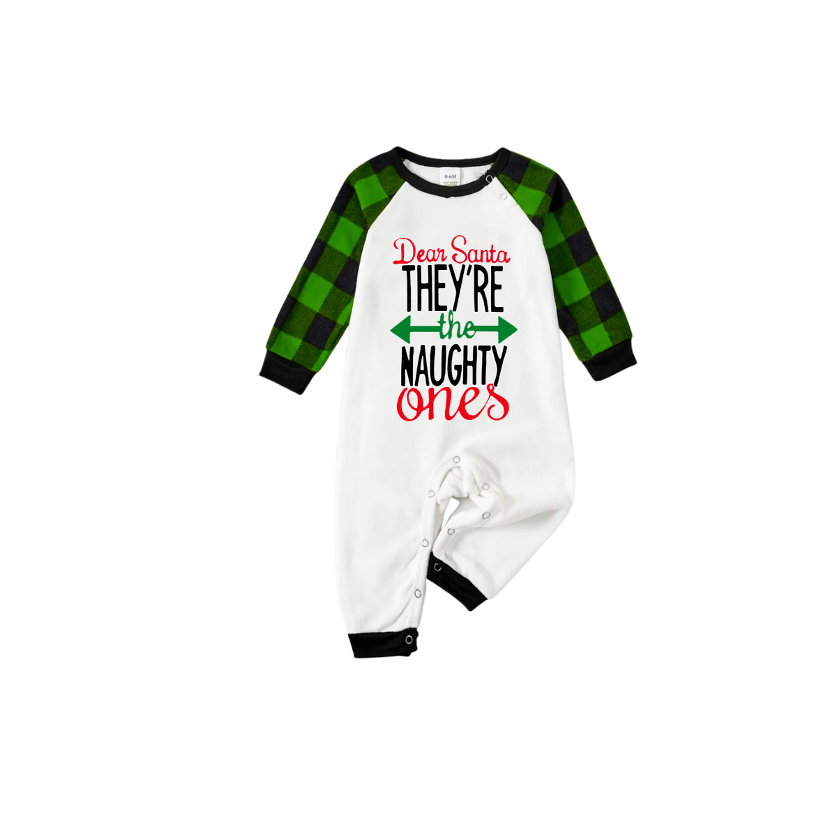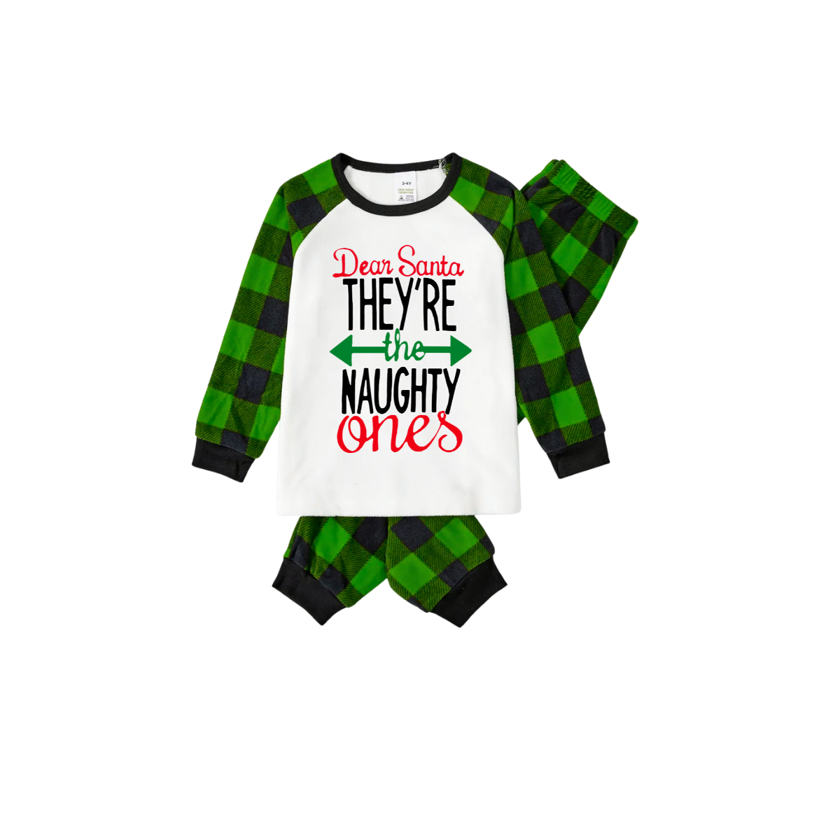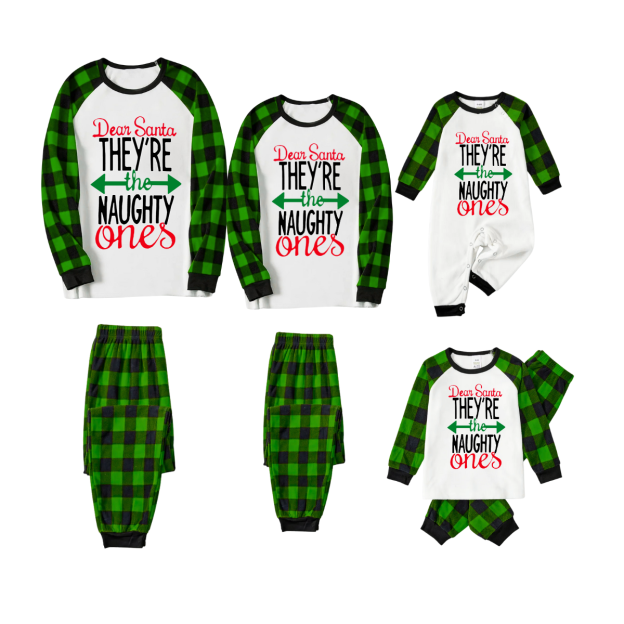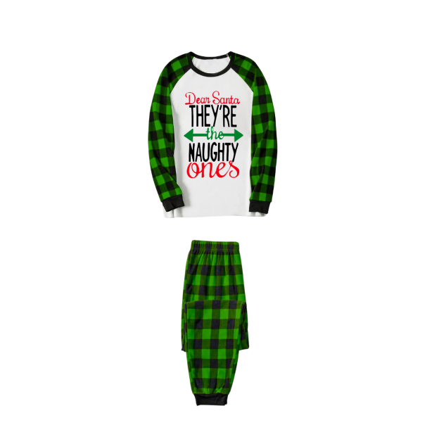 Dear Santa Naughty Ones Family Pajamas Set - White Top, Green Plaid Pants, Plaid Sleeves