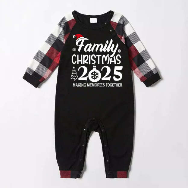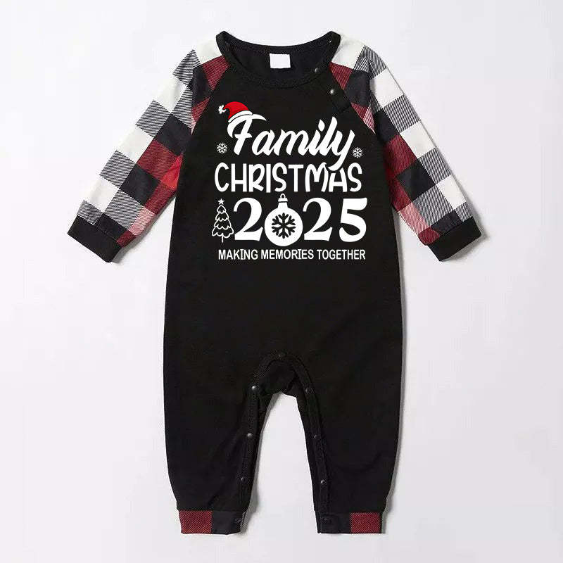 "FAMILY 2025CHRISTMAS MAKING MEMORIES TOGETHER " Text And Santa Hat Printed Pattern- Black Top with Red&Black&White Plaid Sleeves - Family Matching Pajamas