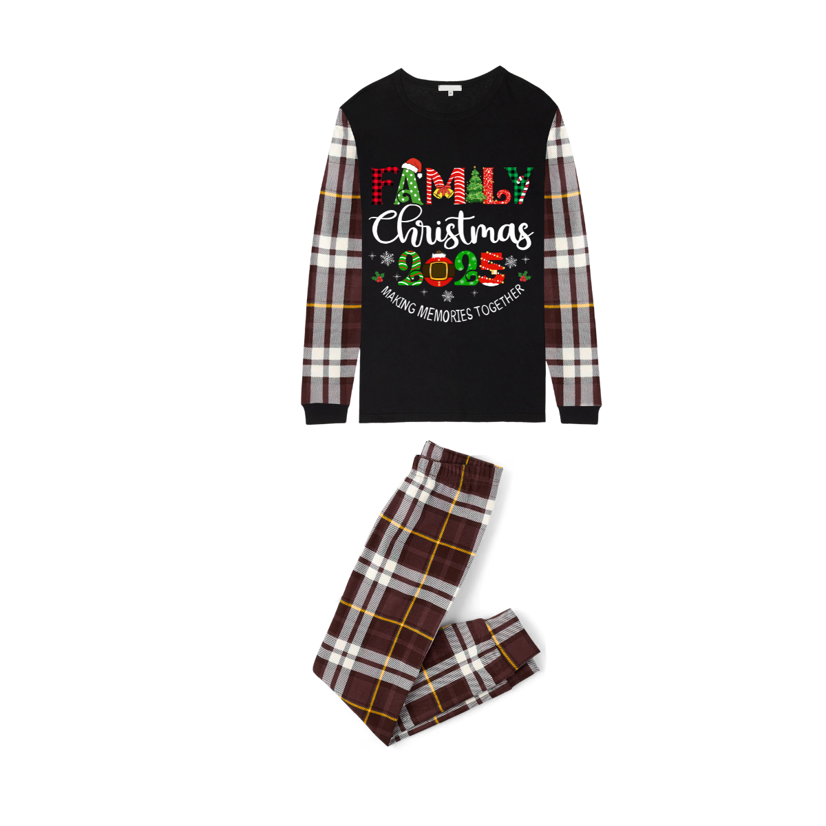 Family Christmas 2025 Making Memories Family Pajamas Set - Black Top, Brown Pants, Brown Plaid Sleeves