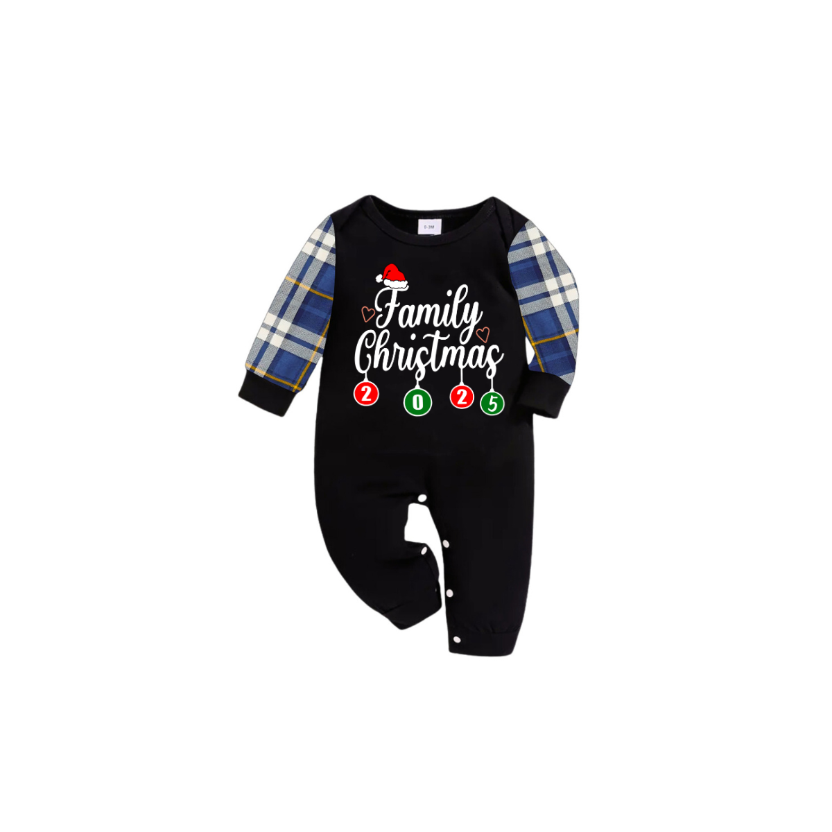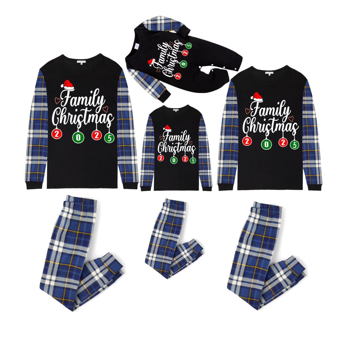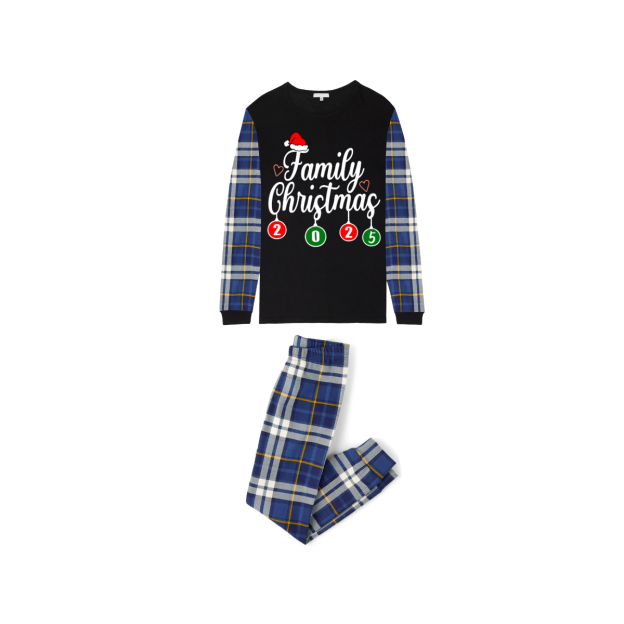 Family Christmas 2025 Pajamas Set - Black Top / Blue Plaid Sleeves & Pants / Santa Hat Print