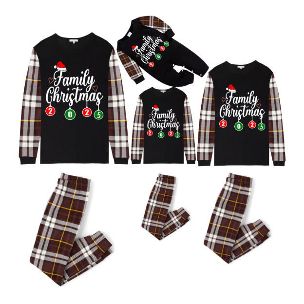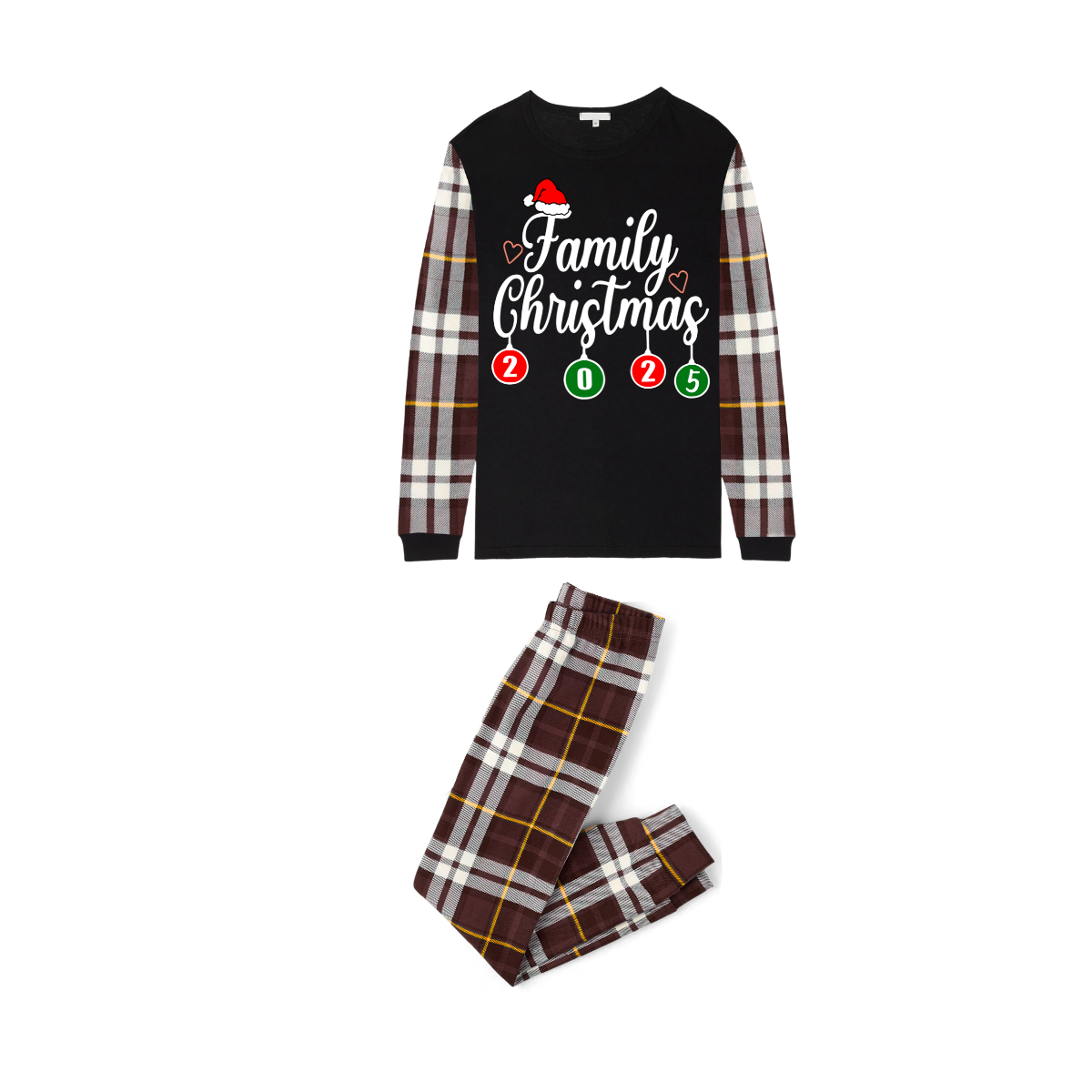 Family Christmas 2025 Pajamas Set - Black Top / Brown Plaid Sleeves & Pants