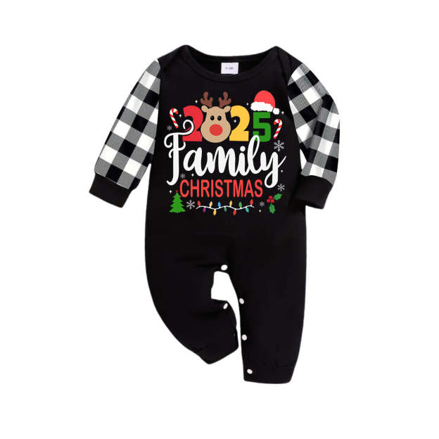 "Family Christmas 2025" Text and Deer Prints Black Long Sleeve Top with Black And White Plaid Pants Family Matching Pajamas