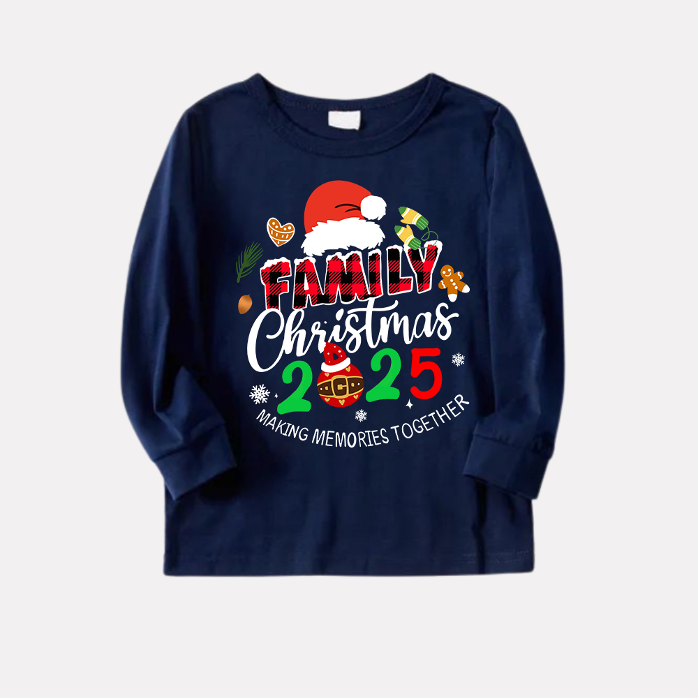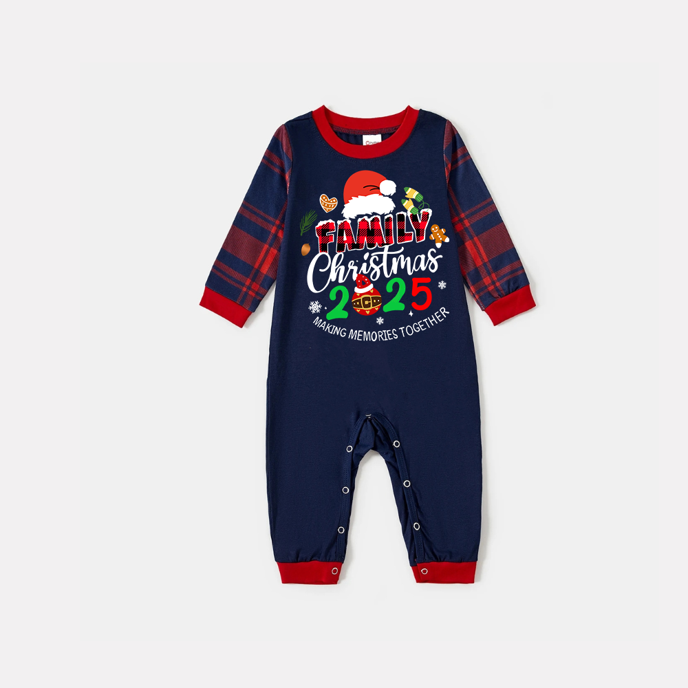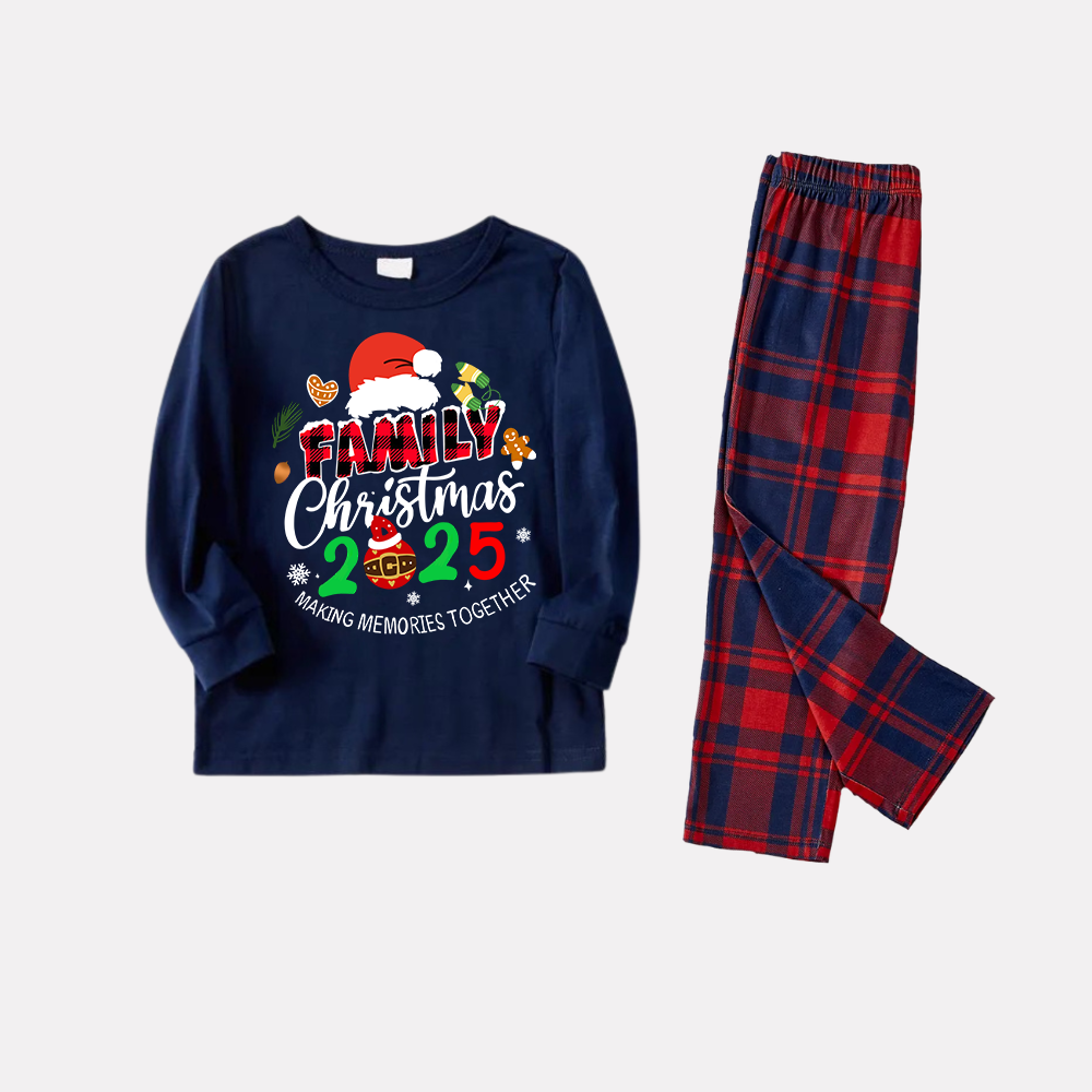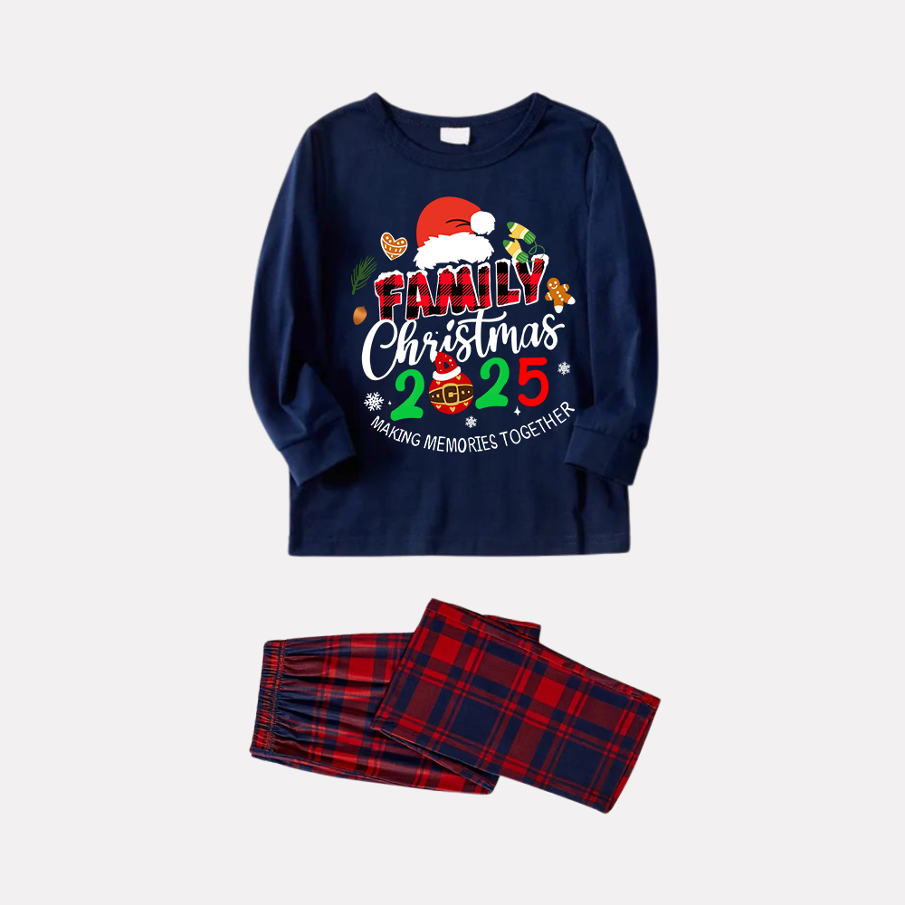 "Family Christmas 2025" Text and Santa Hat Prints Blue Long Sleeves Top with Red and Blue Plaid Pants Christmas Matching Pajamas