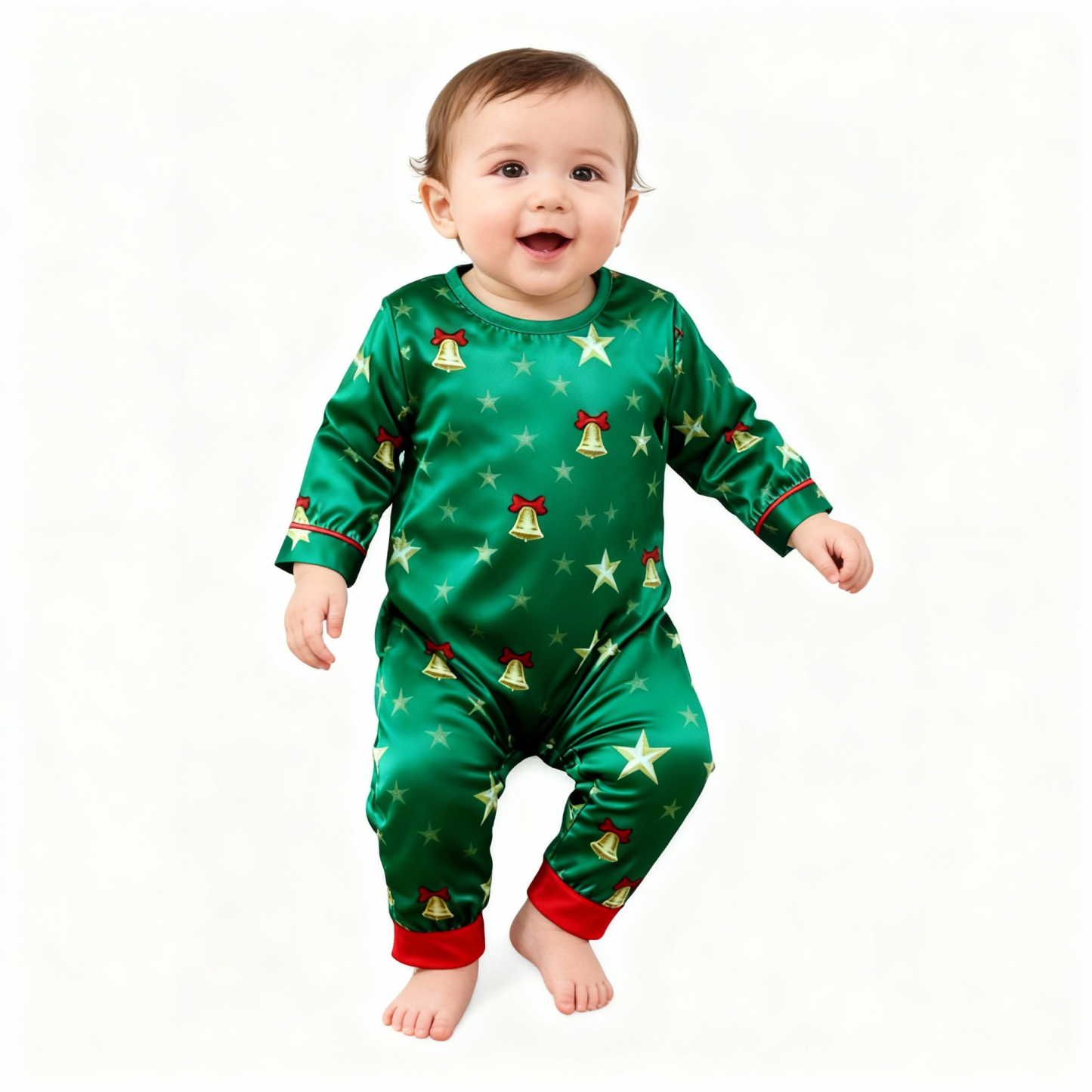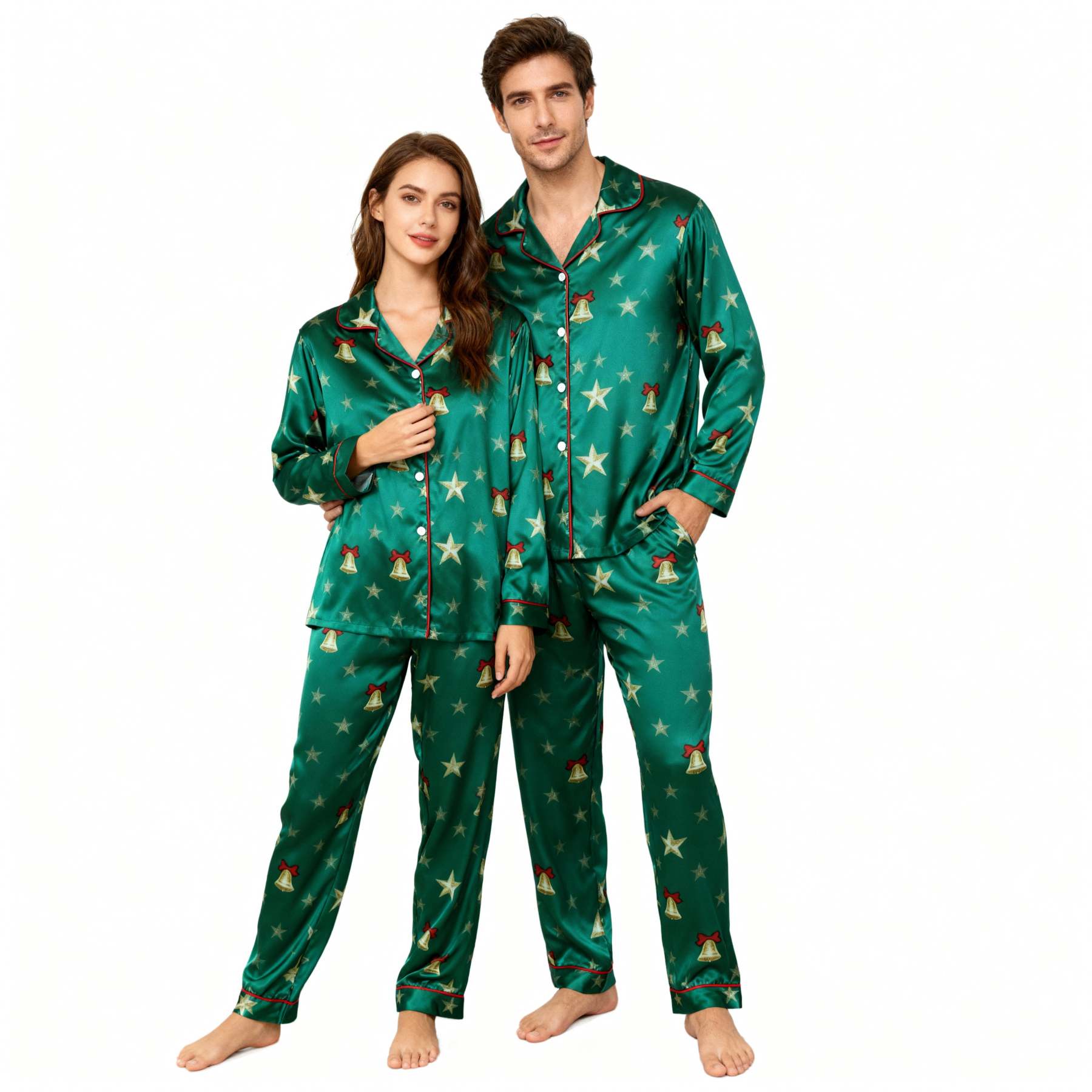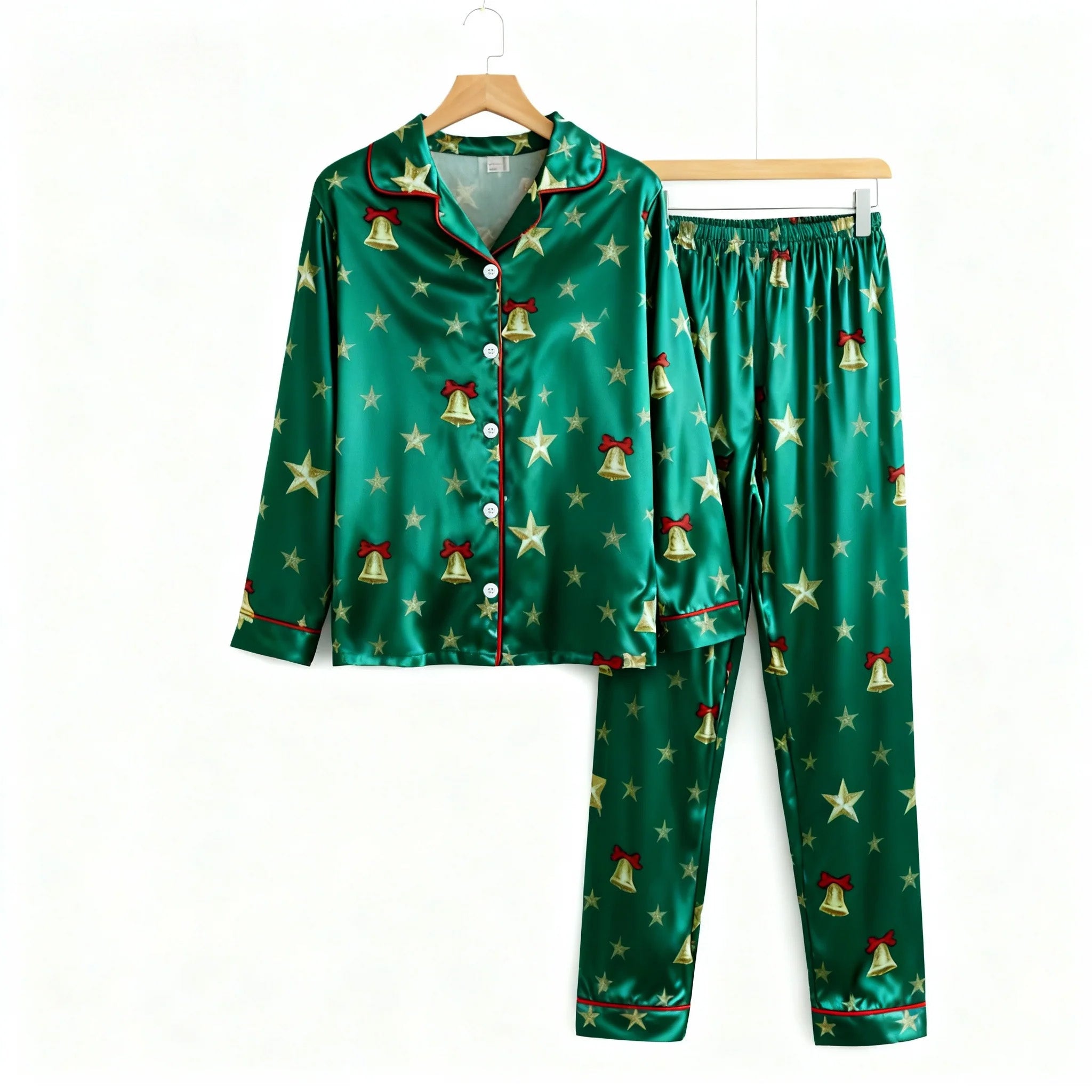 Holiday Family Button-down Green Satin Christmas Pajamas Set