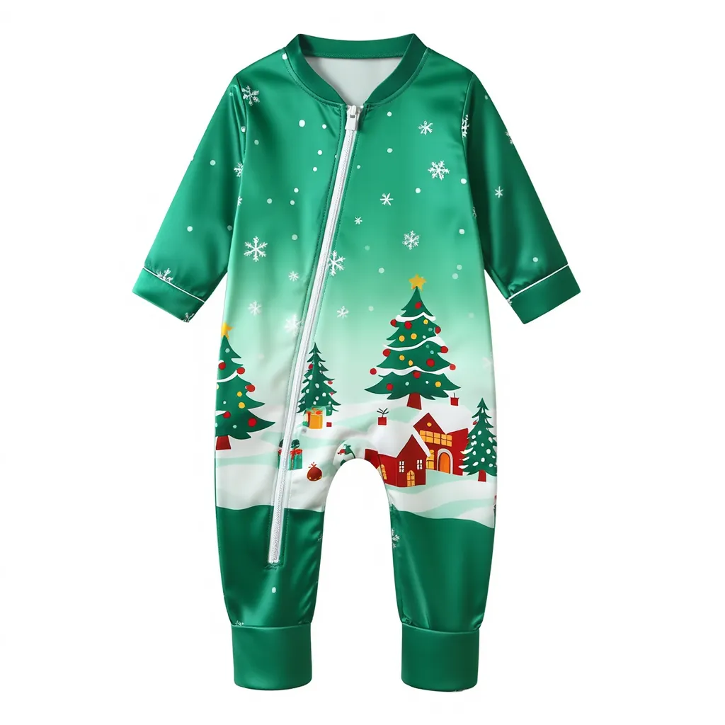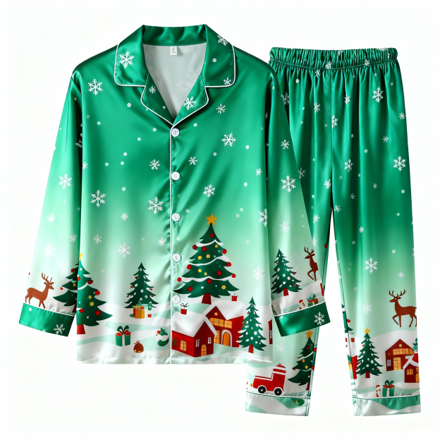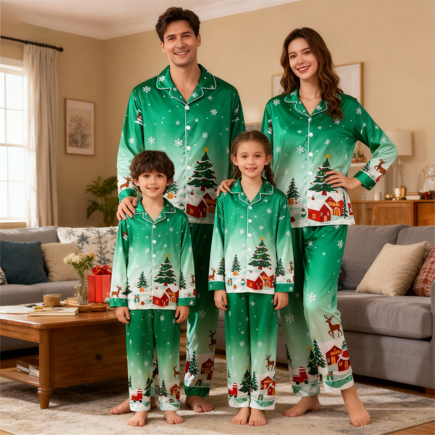 Holiday Family Button-Up Christmas Pattern Printed Green Satin Christmas Pajamas Set