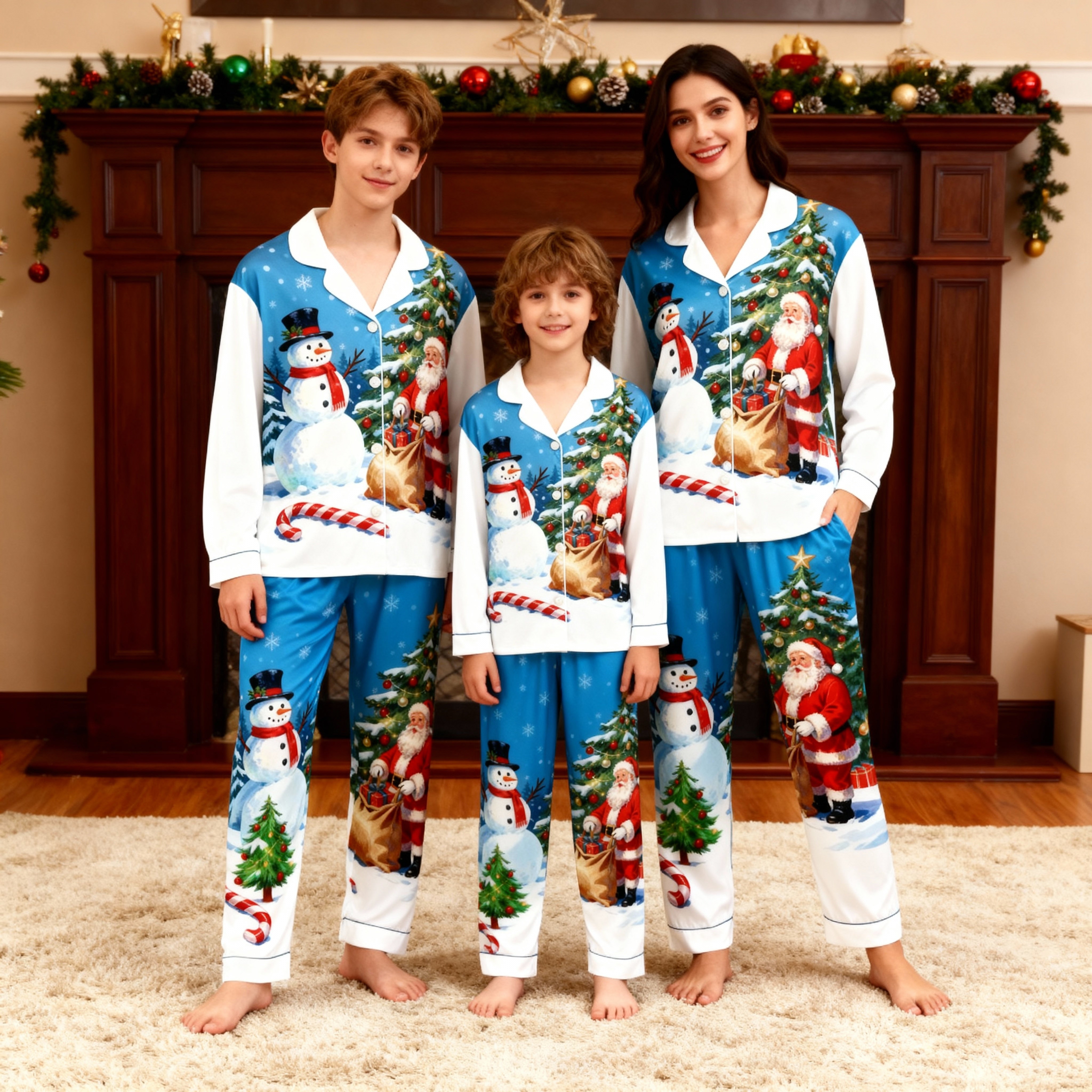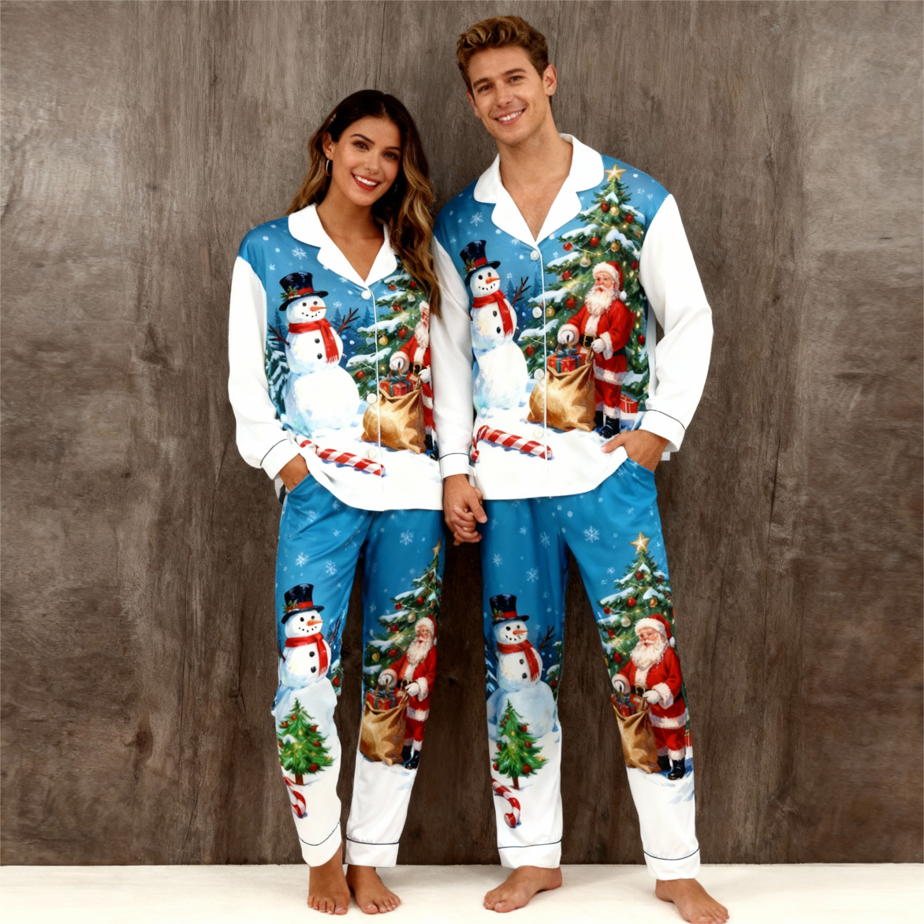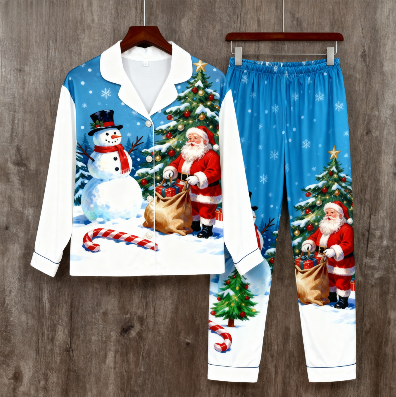 Holiday Family Button-Up Santa and Snowman Printed Satin Christmas Pajamas Set