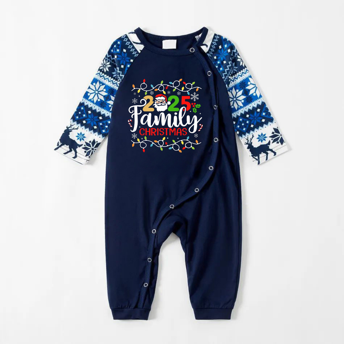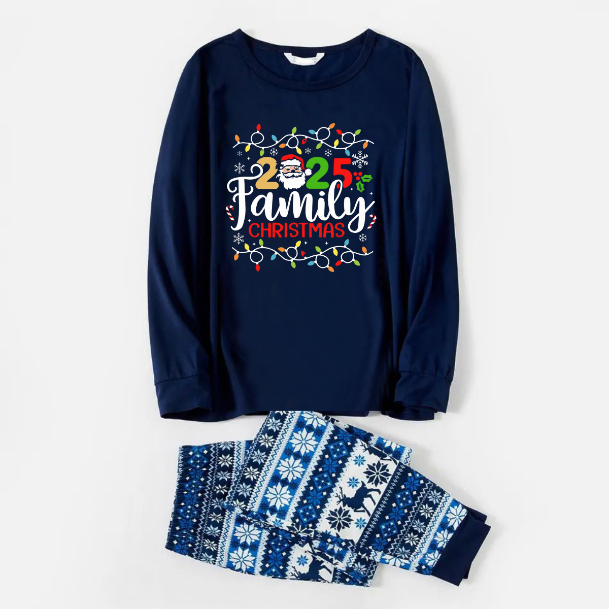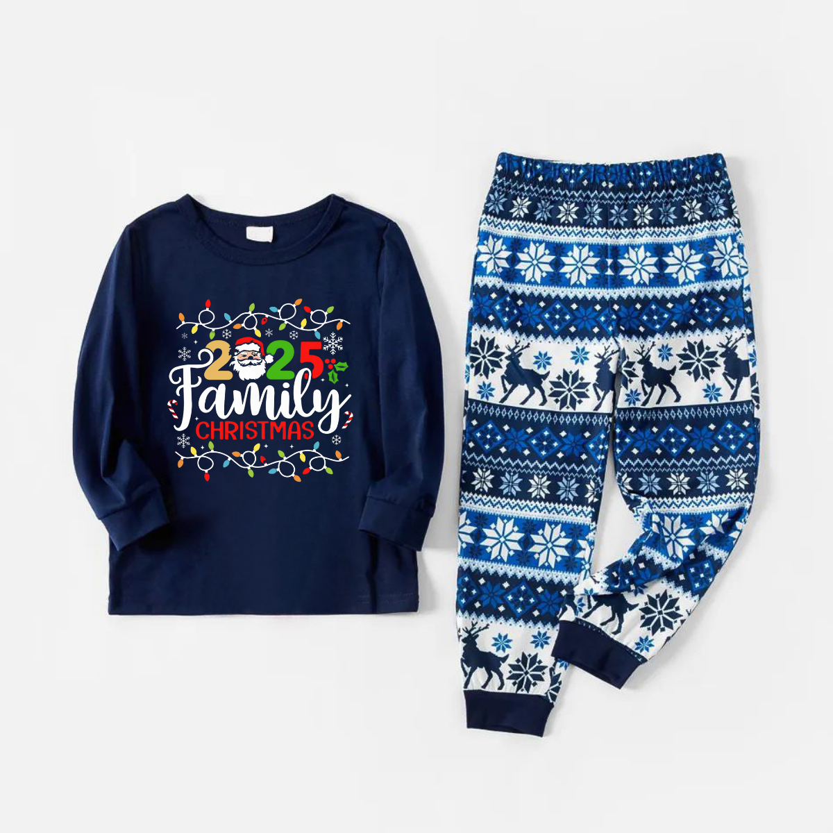 Joyful Blue Christmas Pajamas Set With Christmas Light and "2025 Family Christmas" Text Print