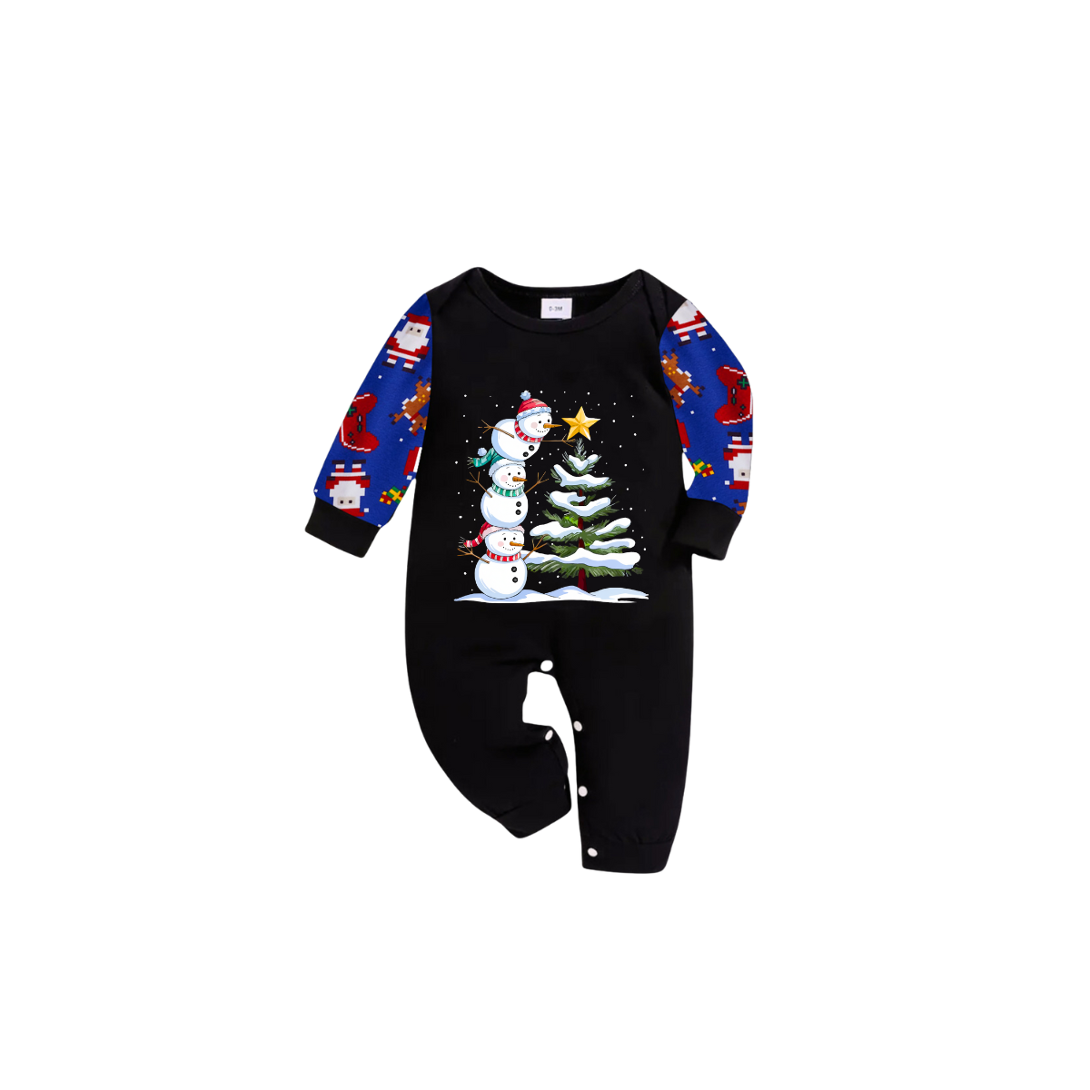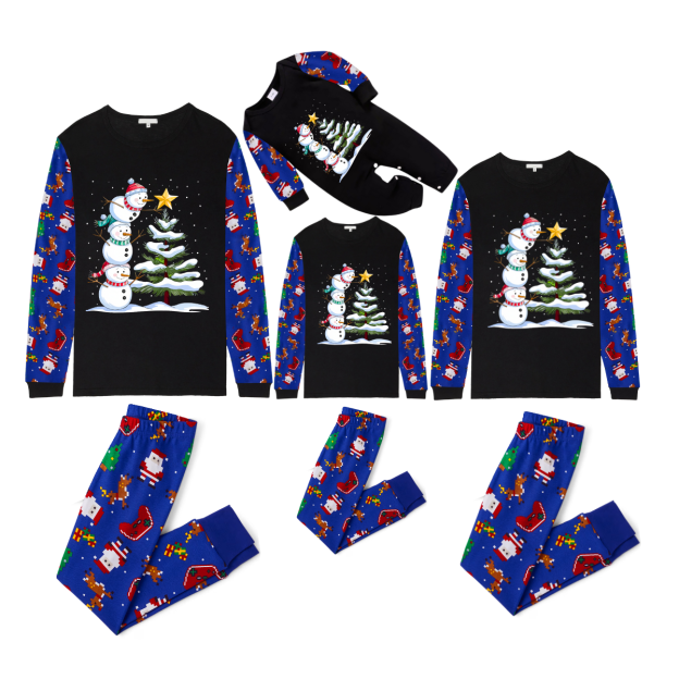 Joyful Blue Color-blocked Christmas Pajamas Set with Snowman & Christmas Tree Print