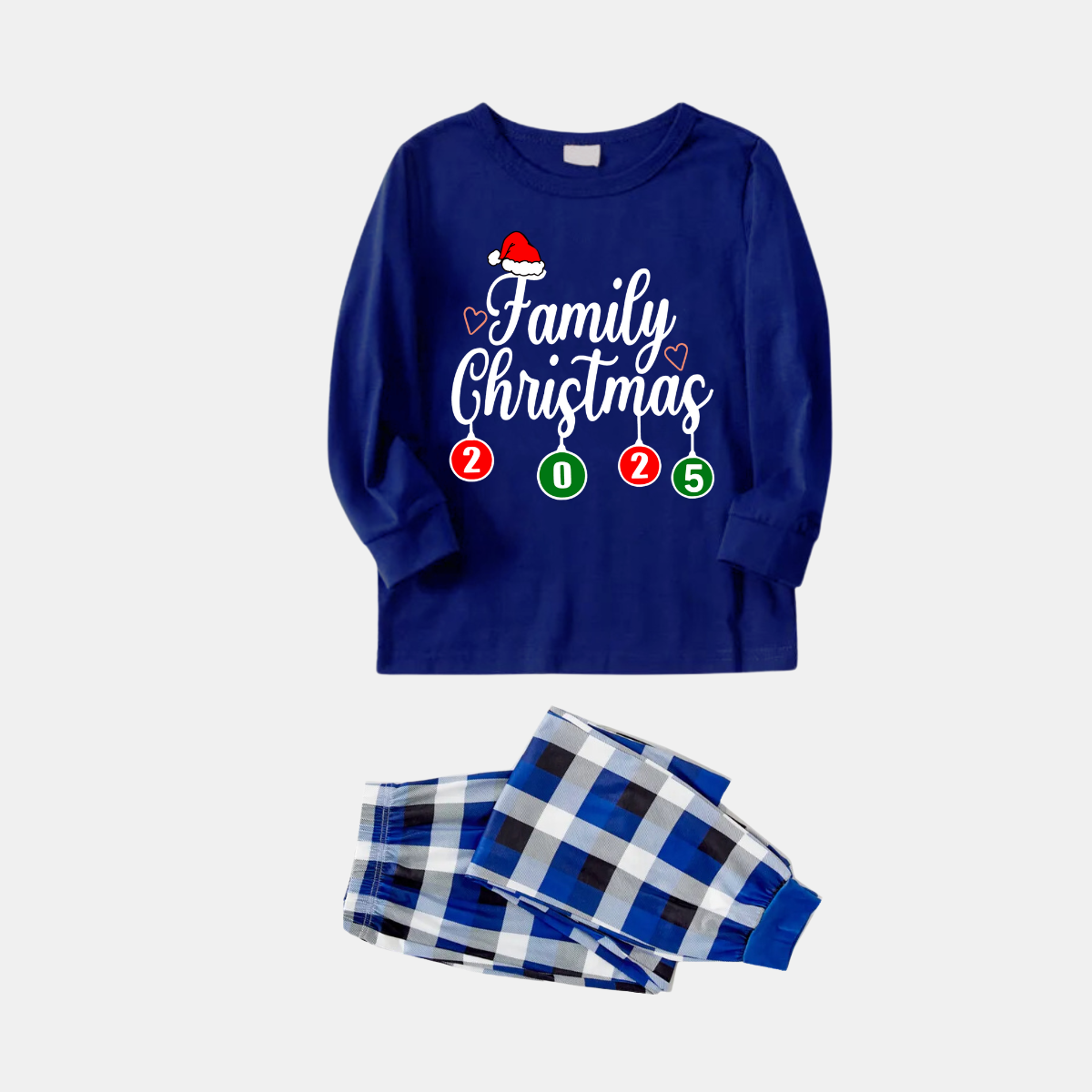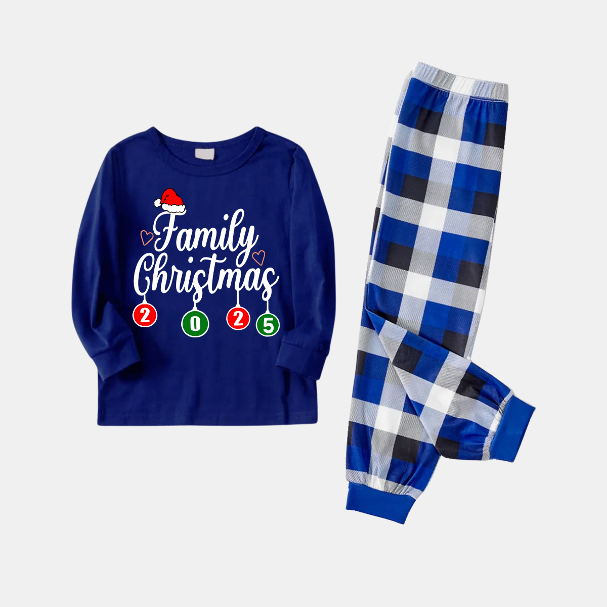 "Family Christmas 2025" Letter Printed Blue Long Sleeves with Blue&White&Black Plaid Pants Family Matching Pajamas