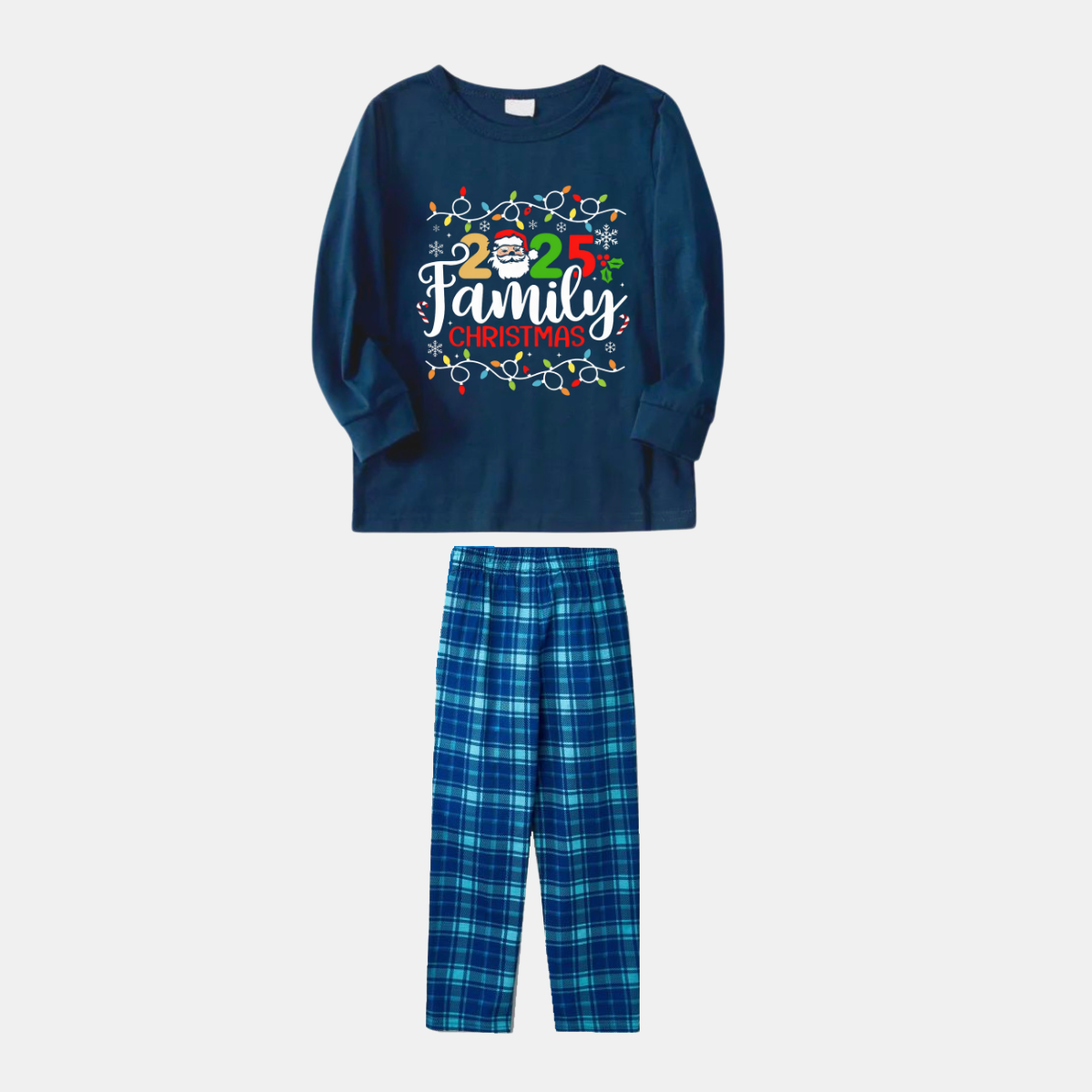 Navy & Sky Blue Plaid Christmas Pajamas Set With Christmas Light and "2025 Family Christmas" Text Print