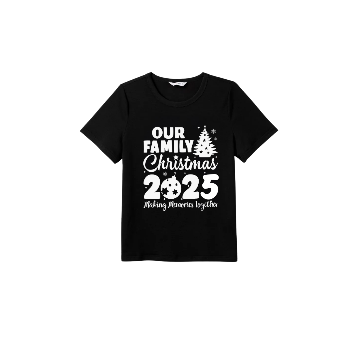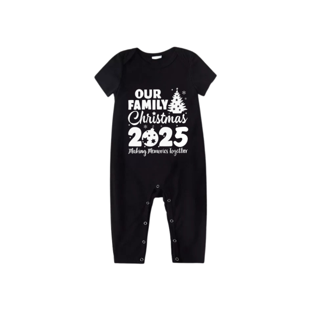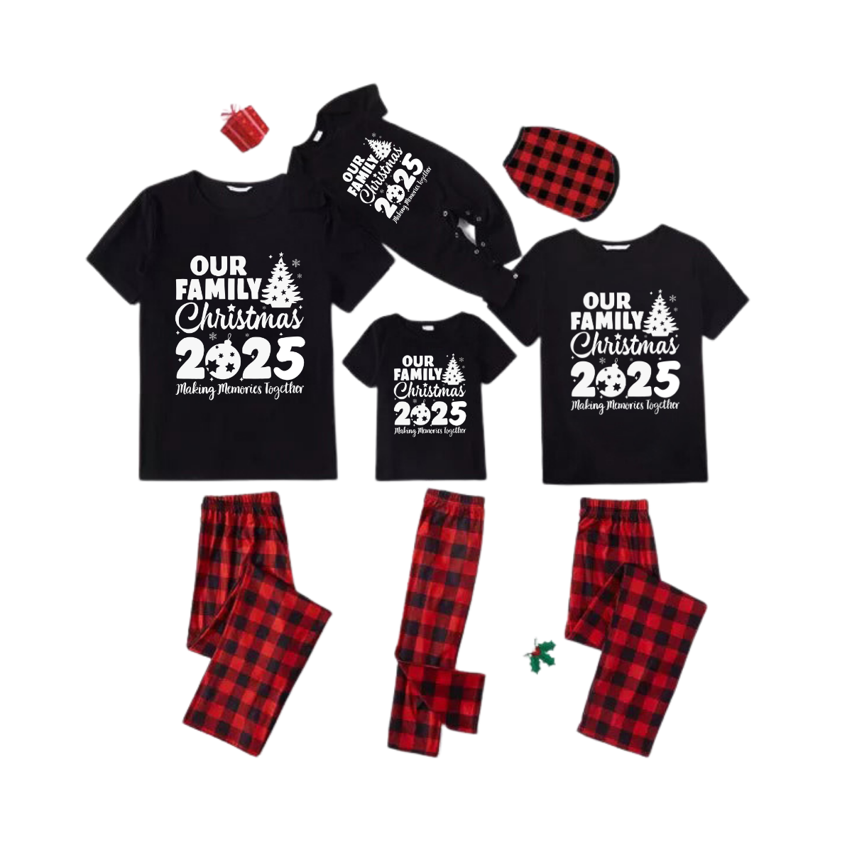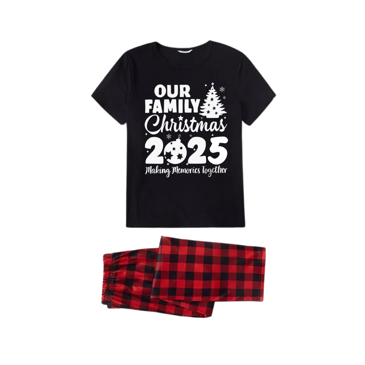 Our Family Christmas 2025 Family Pajamas Set - Black Top Red Pants Red Plaid Sleeves Christmas Tree Print