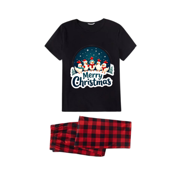 Red and Black Plaid Short Sleeve Christmas Pajamas Set With Happy Chickens and "Merry Christmas" Text Print