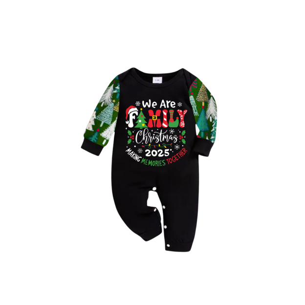 We Are Family Christmas 2025 Making Memories Family Pajamas Set - Black Top, Green Pants, Christmas Tree Print Sleeves