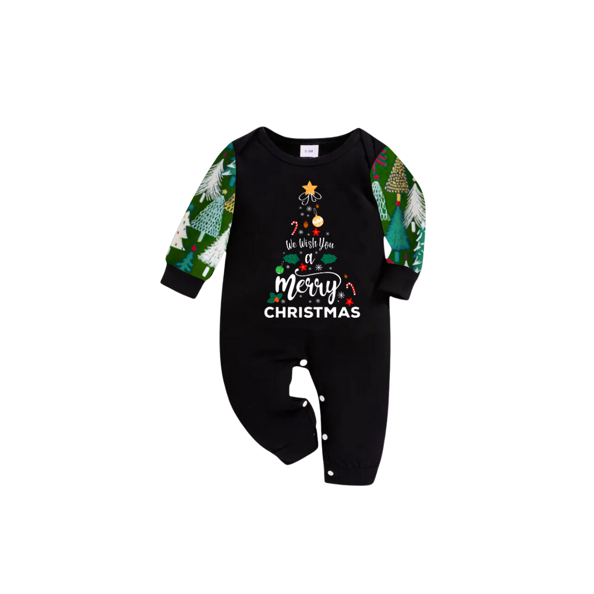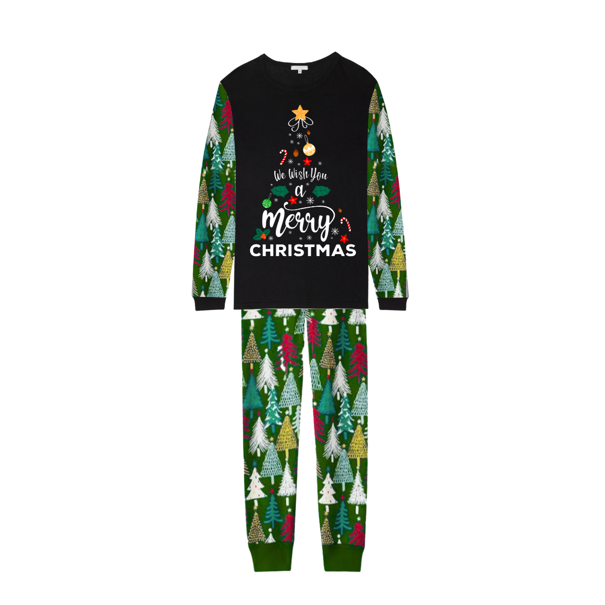 We Wish You a Merry Christmas Family Pajamas Set - Black Top / Christmas Tree Print Green Pants / Christmas Tree Print Sleeves