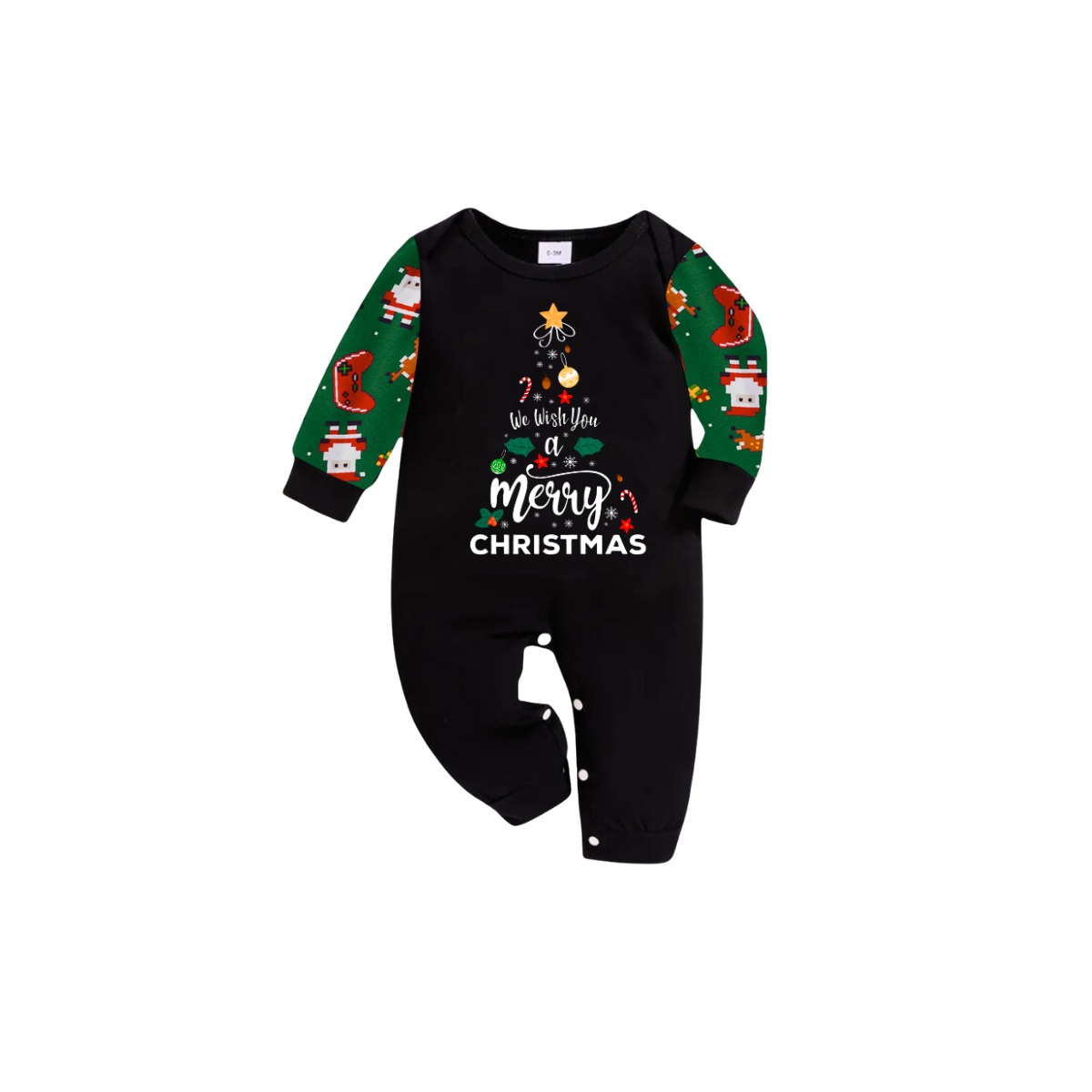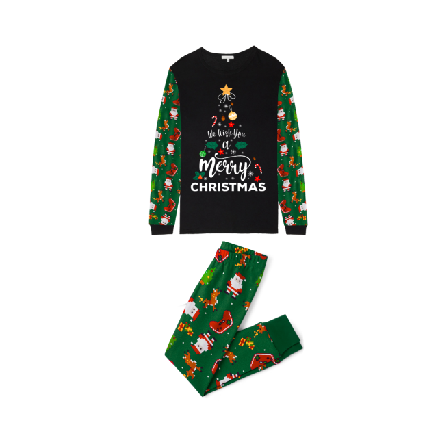 We Wish You a Merry Christmas Family Pajamas Set - Black Top / Green Santa Print Pants / Green Santa Print Sleeves