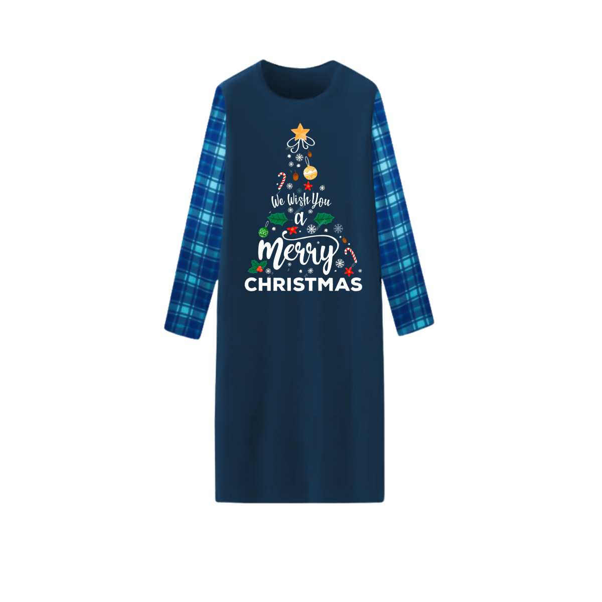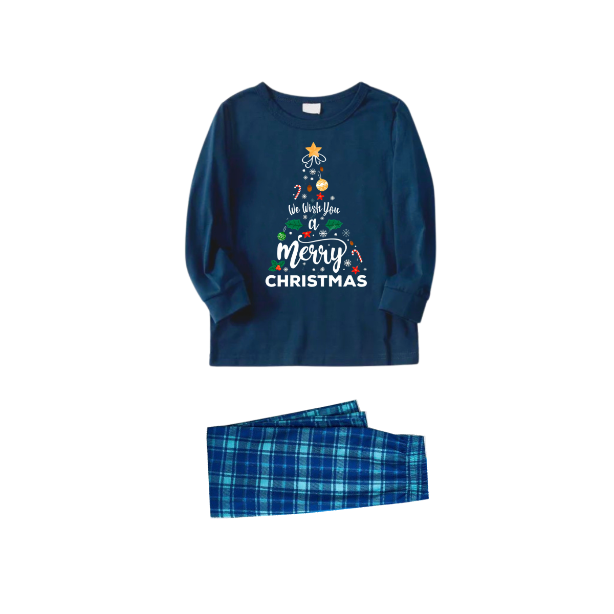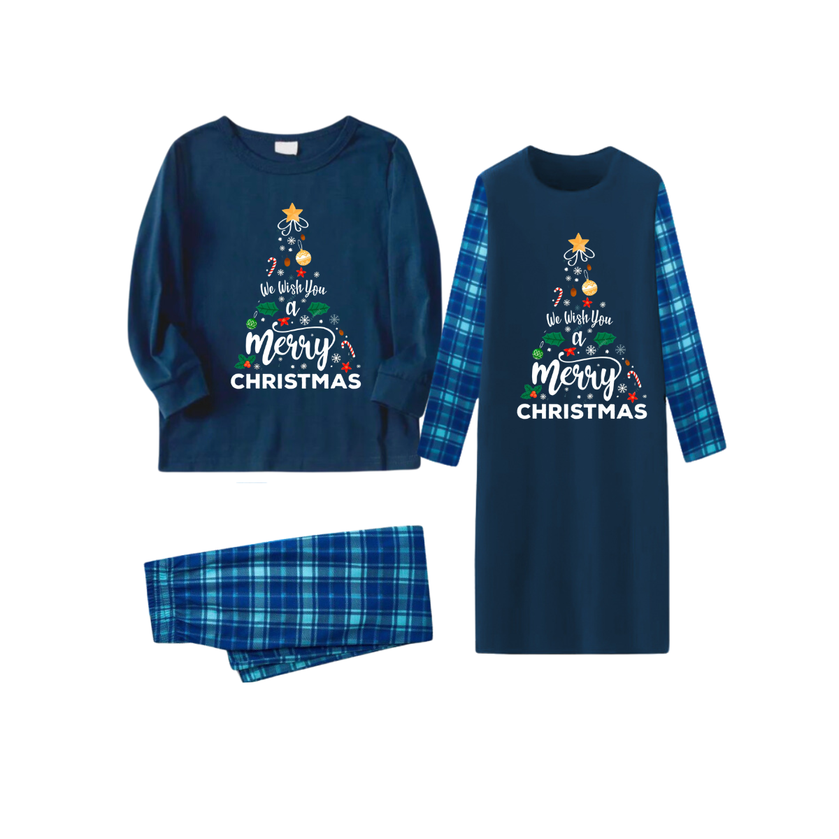 "We Wish You a Merry Christmas" Printed Blue Long Sleeve Top With Blue&Green Plaid Couple Matching Pajamas